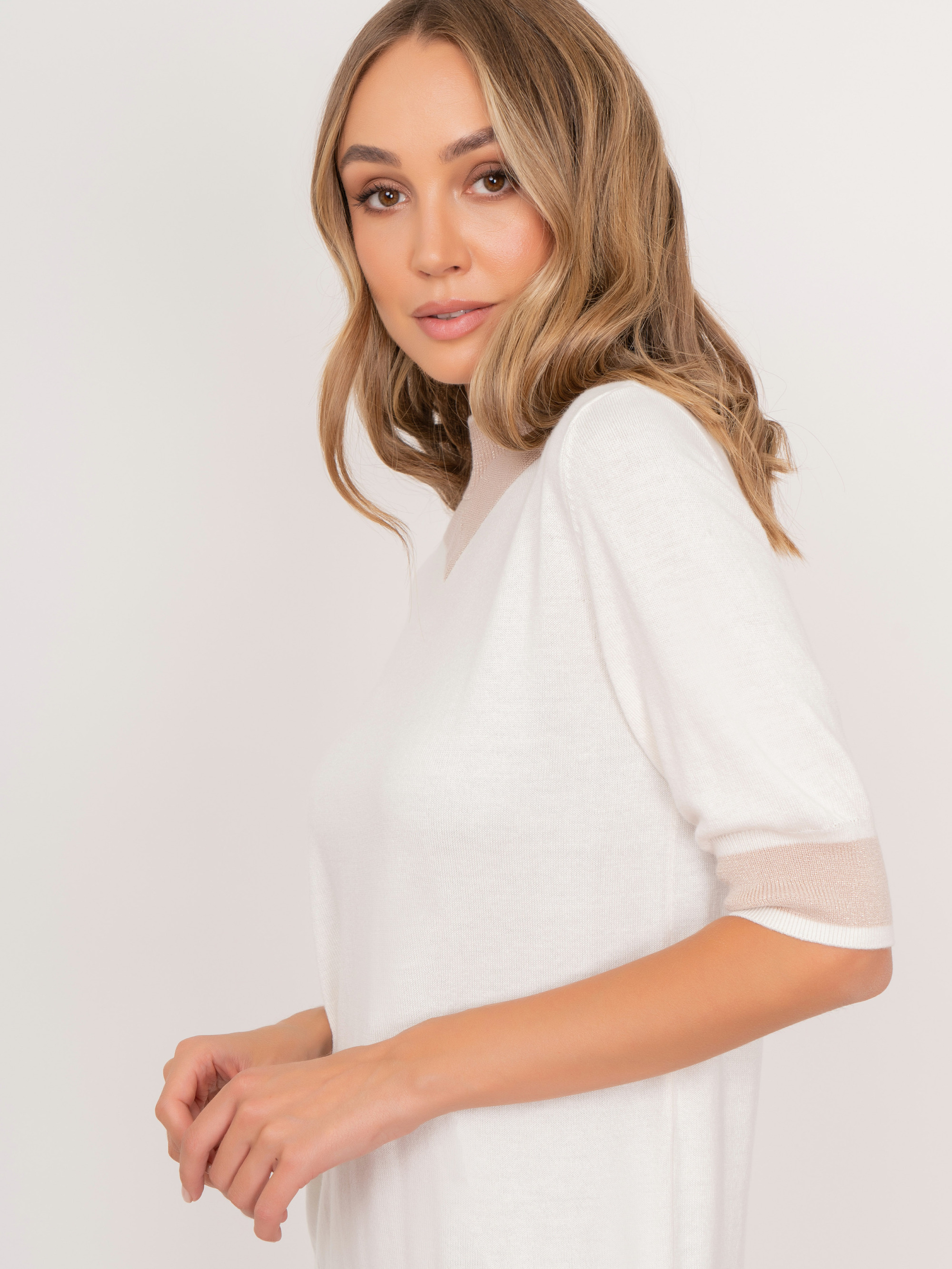 На сайте указаны российские размеры. Трикотажный полуприлегающий джемпер с воротником воронка, с коротким 1/2 рукавом, с бежевыми вставками. Представлен в молочном и черном цветах. Рост модели: 175 см. Длина джемпер: 57 см.