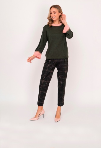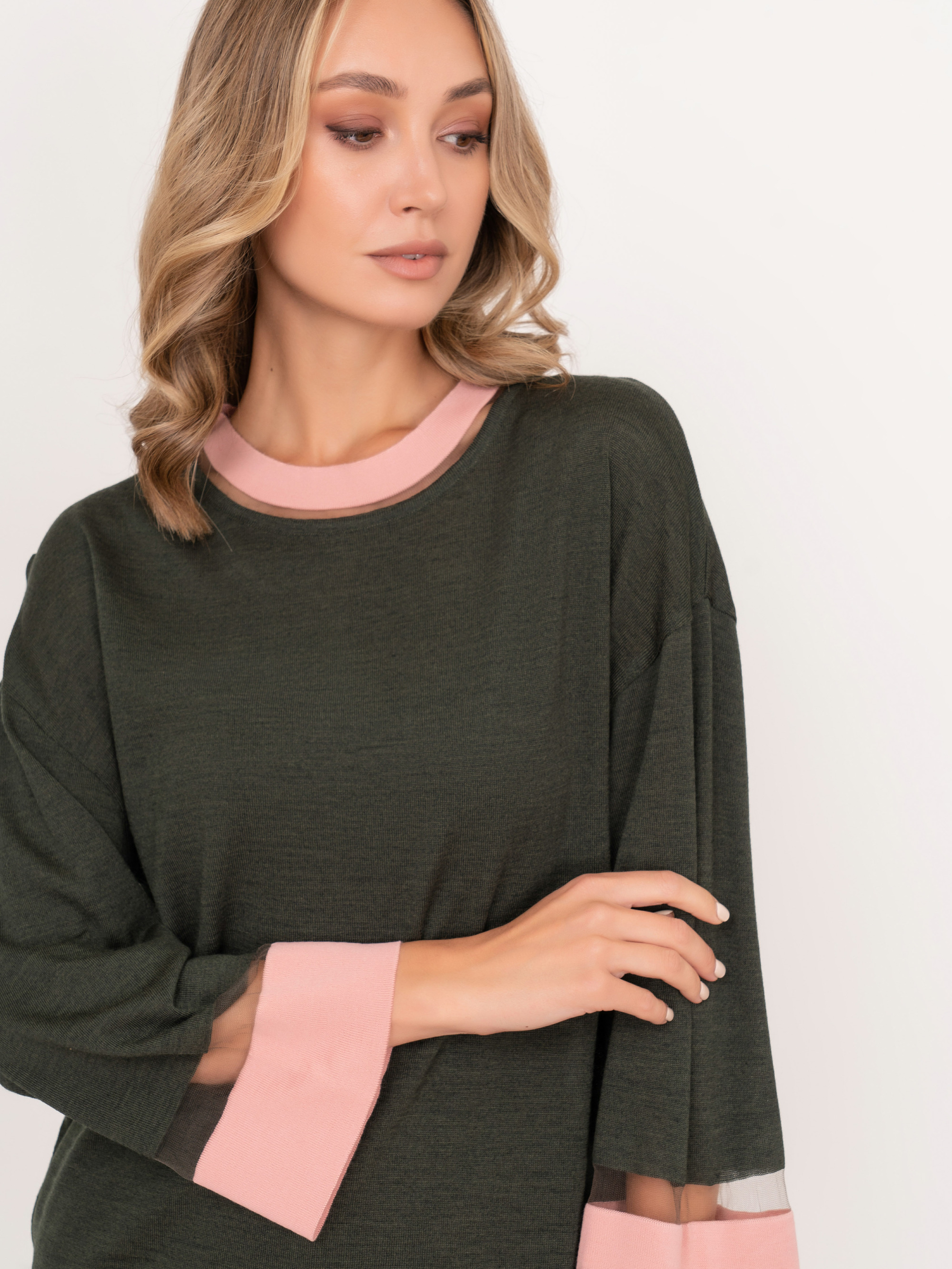 На сайте указаны российские размеры. Прямой трикотажный хаки джемпер с круглым вырезом, с длинным рукавом 7/8, с кулиской понизу, с розовыми и прозрачными вставками по горловине и на рукавах. Рост модели: 175 см. Длина джемпера: 56 см.