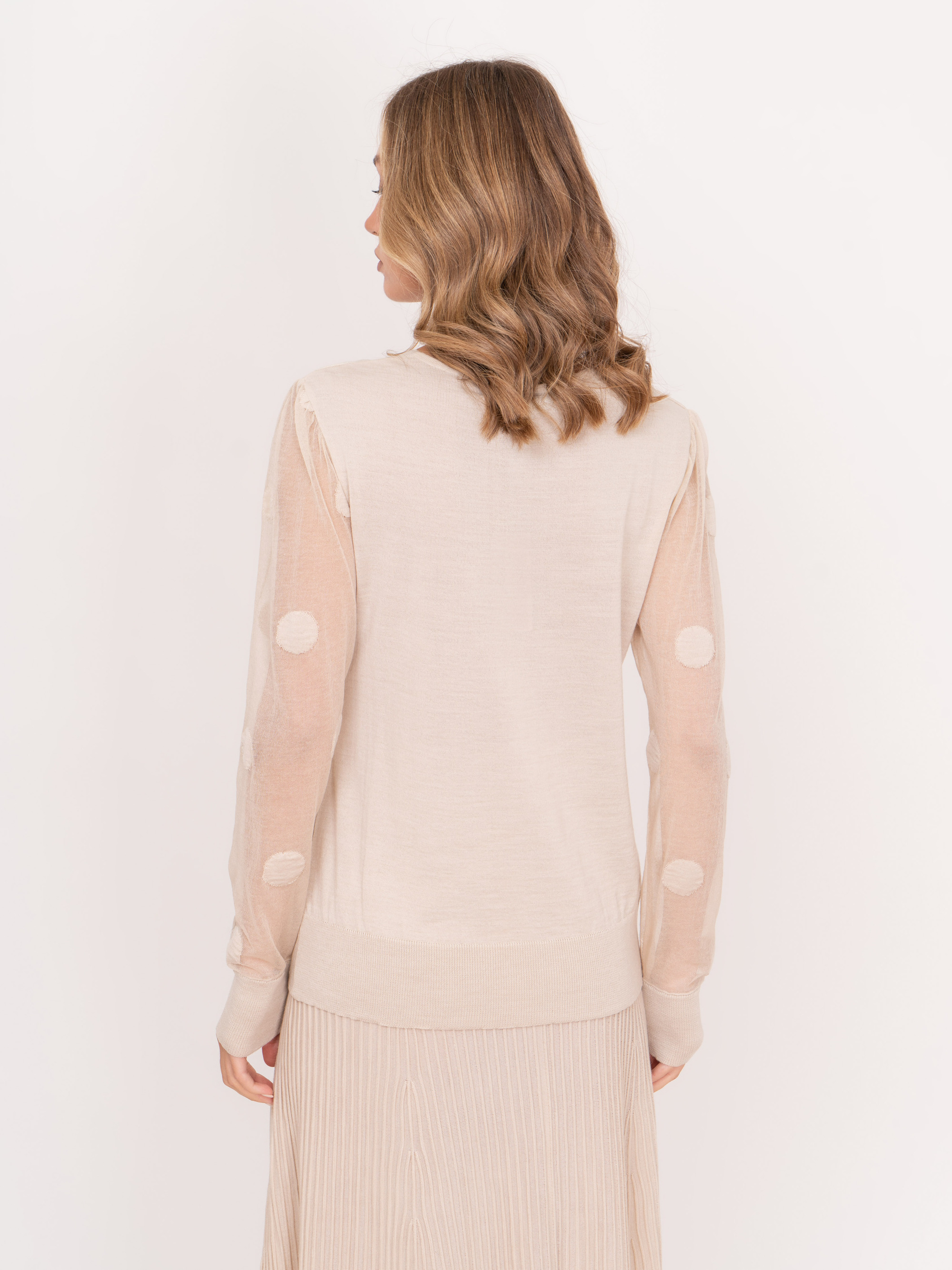 На сайте указаны российские размеры. Прямой трикотажный светло-бежевый джемпер с V-образным вырезом, с длинным прозрачным рукавом в крупный горох, с акцентной полосой по центру. Рост модели: 175 см. Длина джемпера: 60 см.