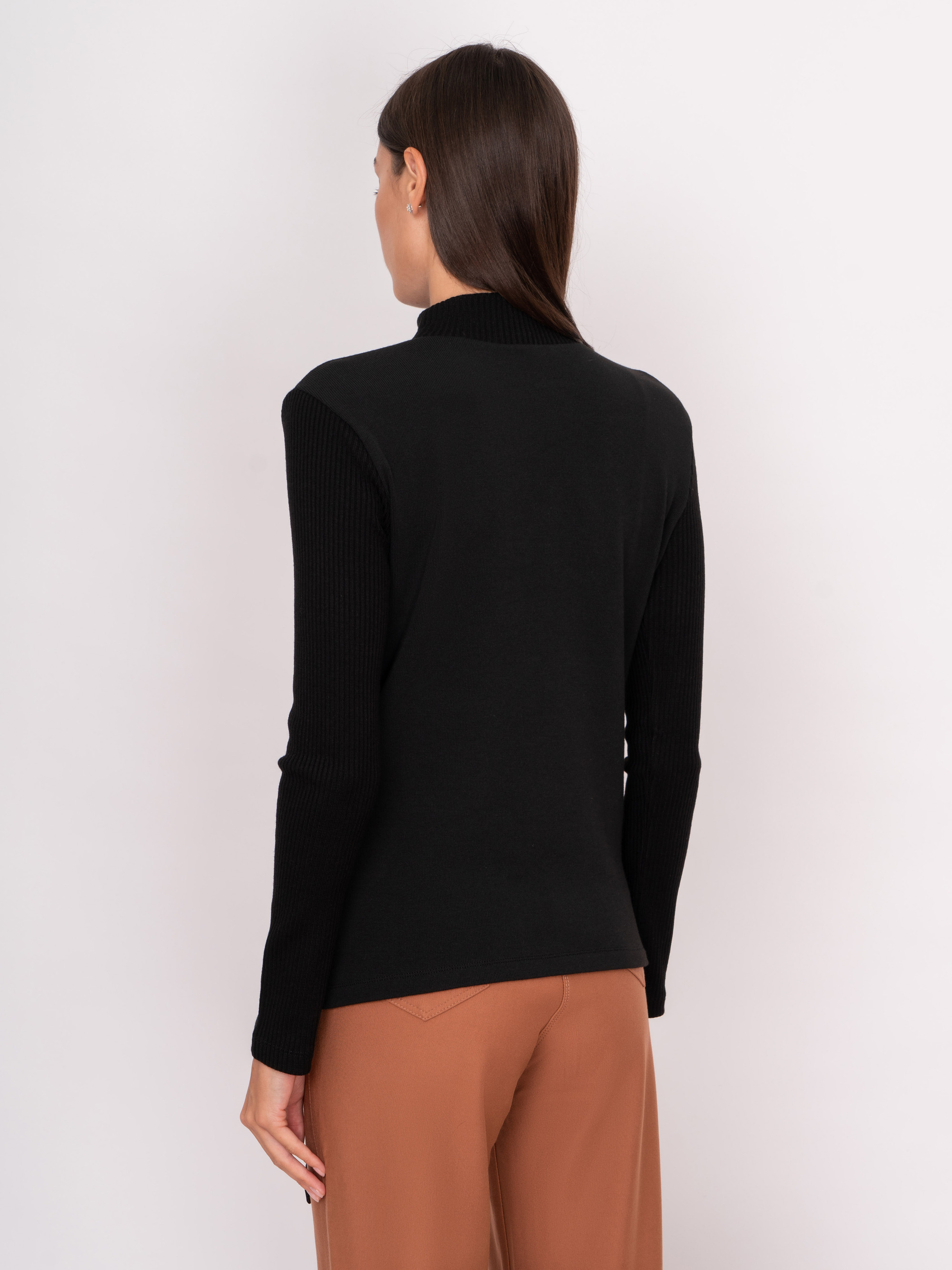 На сайте указаны российские размеры. Полуприлегающий трикотажный черный вязаный свитер с воротником-воронка, с длинным рукавом, с серыми фактурными надписями. Рост модели: 175 см. Длина джемпера: 56 см.