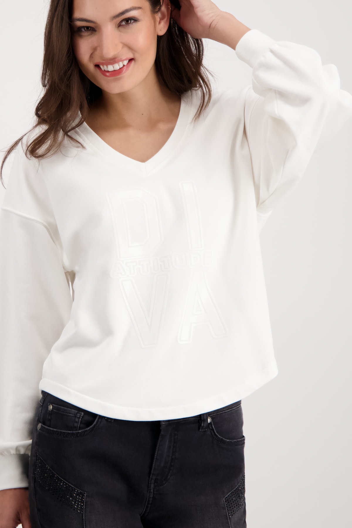 На сайте указаны российские размеры. Толстовка с длинными рукавами, V-образным вырезом и принтом. Длинные рукава с приспущенной линией плеч заканчиваются широкой манжетой с воланами. Прямой фасон дополняется V-образным вырезом и закругленным низом, а передняя часть украшена объемной надписью в тон. Вы чувствуете себя наиболее комфортно в простых и удобных топах? Тогда вам не обойтись без этой модели. Рост модели: 179 см. Длина по спине: 68 см.