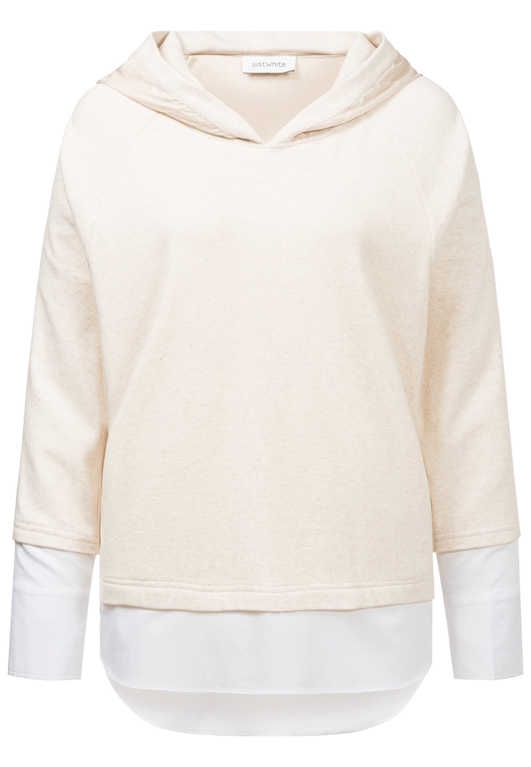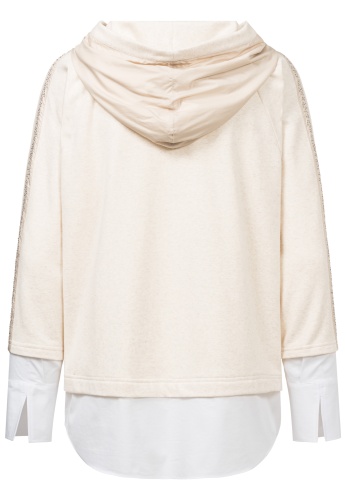 На сайте указаны российские размеры. Удобный пуловер с капюшоном, блузочной вставкой и блестящими деталями. Простая толстовка с капюшоном сочетает в себе все эти свойства со встроенной блузочной вставкой. Капюшон привлекает особое внимание, так как выполнен из слегка мерцающего атласа и умело выделяется на фоне остального потового материала. Модель ростом 177 см Измерения для 44 размера: Окружность груди: 113 см Обхват бедер: 112 см Длина спинки: 70 см Длина рукава: 71 см