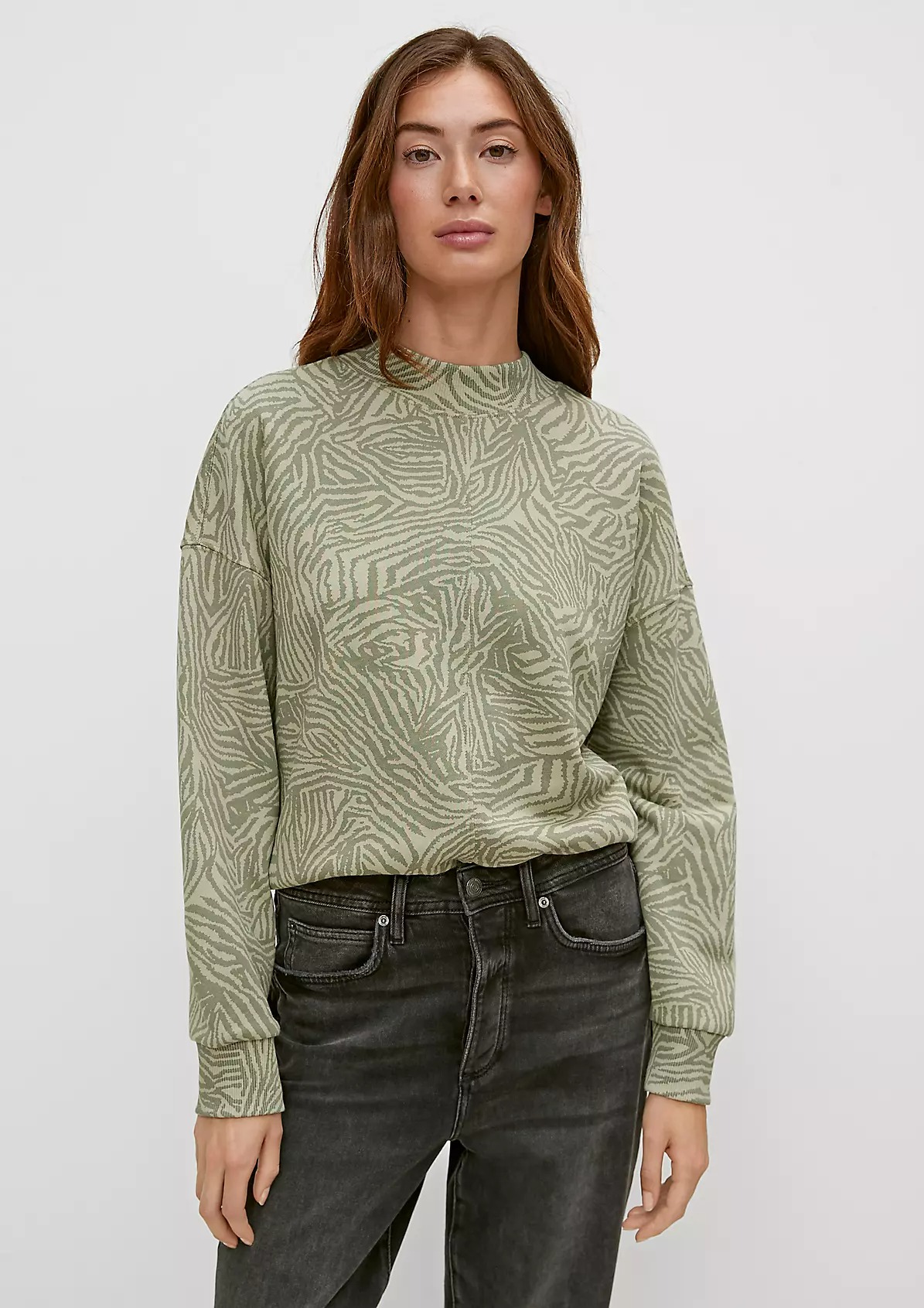 На сайте указаны российские размеры. Укороченный джемпер из мягкой ткани с анималистичным принтом. Круглый вырез горловины с отделкой в рубчик. Длинные рукава с ребристыми манжетами. Эластичный низ, с отделкой в рубчик. Длина спины: 56 см в размере 42. Рост модели 176 см.