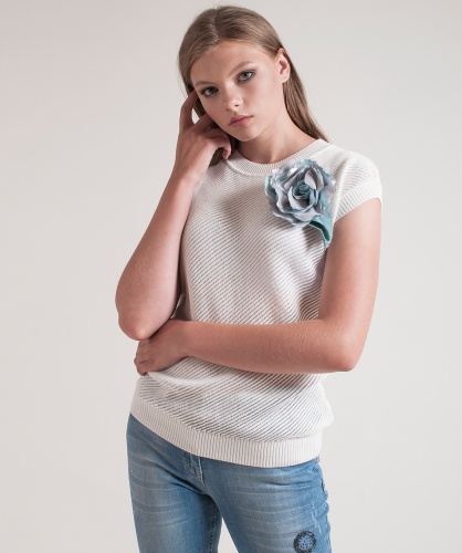Джемпер прямого кроя. Круглый вырез горловины, короткие цельнокроеные рукава. Перед изделия выполнен ажурной машинной вязкой. Украшение в виде цветка.