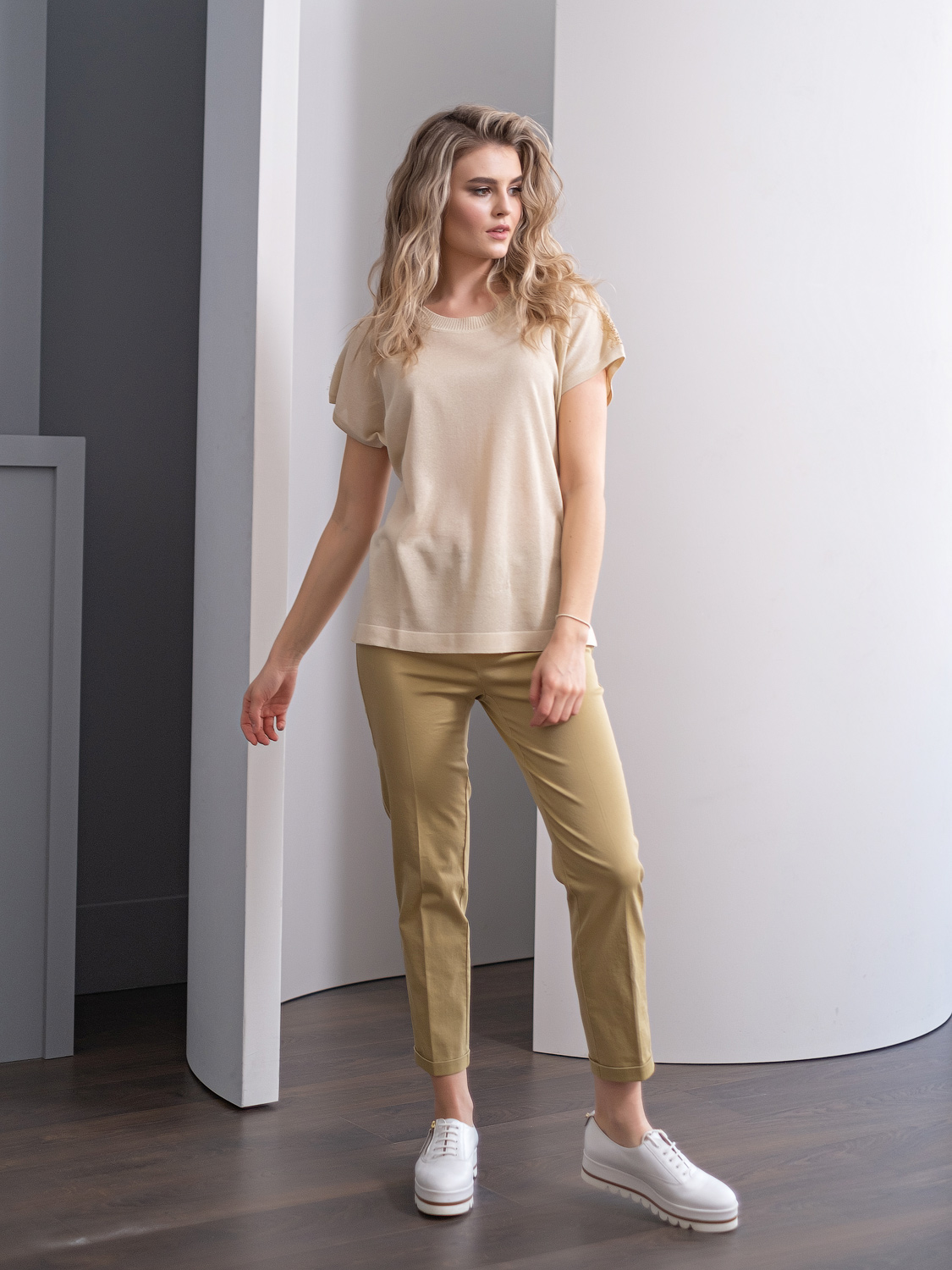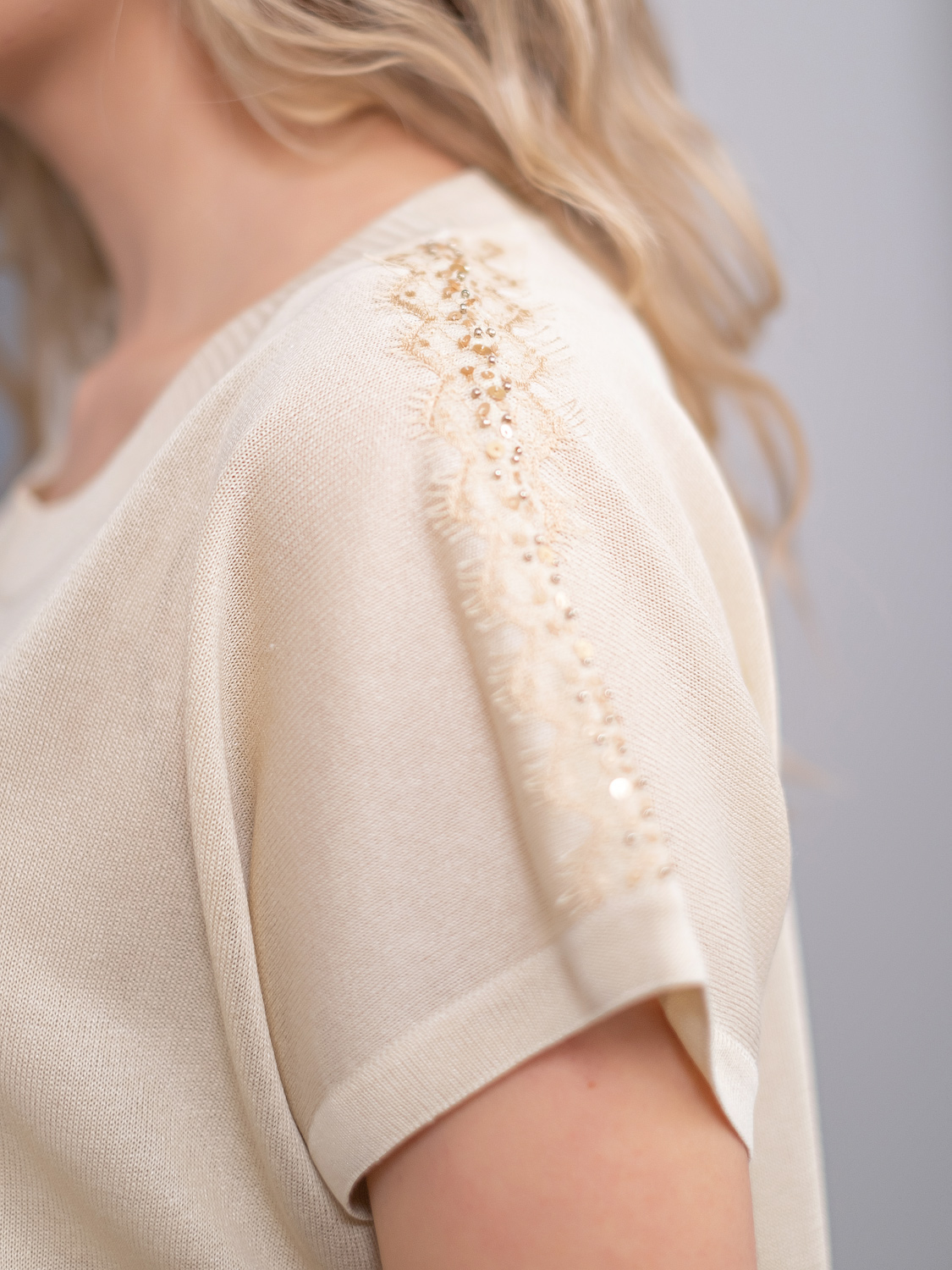 Однотонный джемпер в нюдовом оттенке – базовая вещь капсульного гардероба любой современной женщины. Джемпер идеально сочетается с различными комплектами одежды, может выступать как самостоятельный верх или надеваться под жакет.Короткий цельнокроеный рукав оголяет руки и визуально стройнит силуэт. Кружевной декоративный элемент украшает линию плечевого шва. Круглый вырез горловины подчеркивает изящество линии шеи.