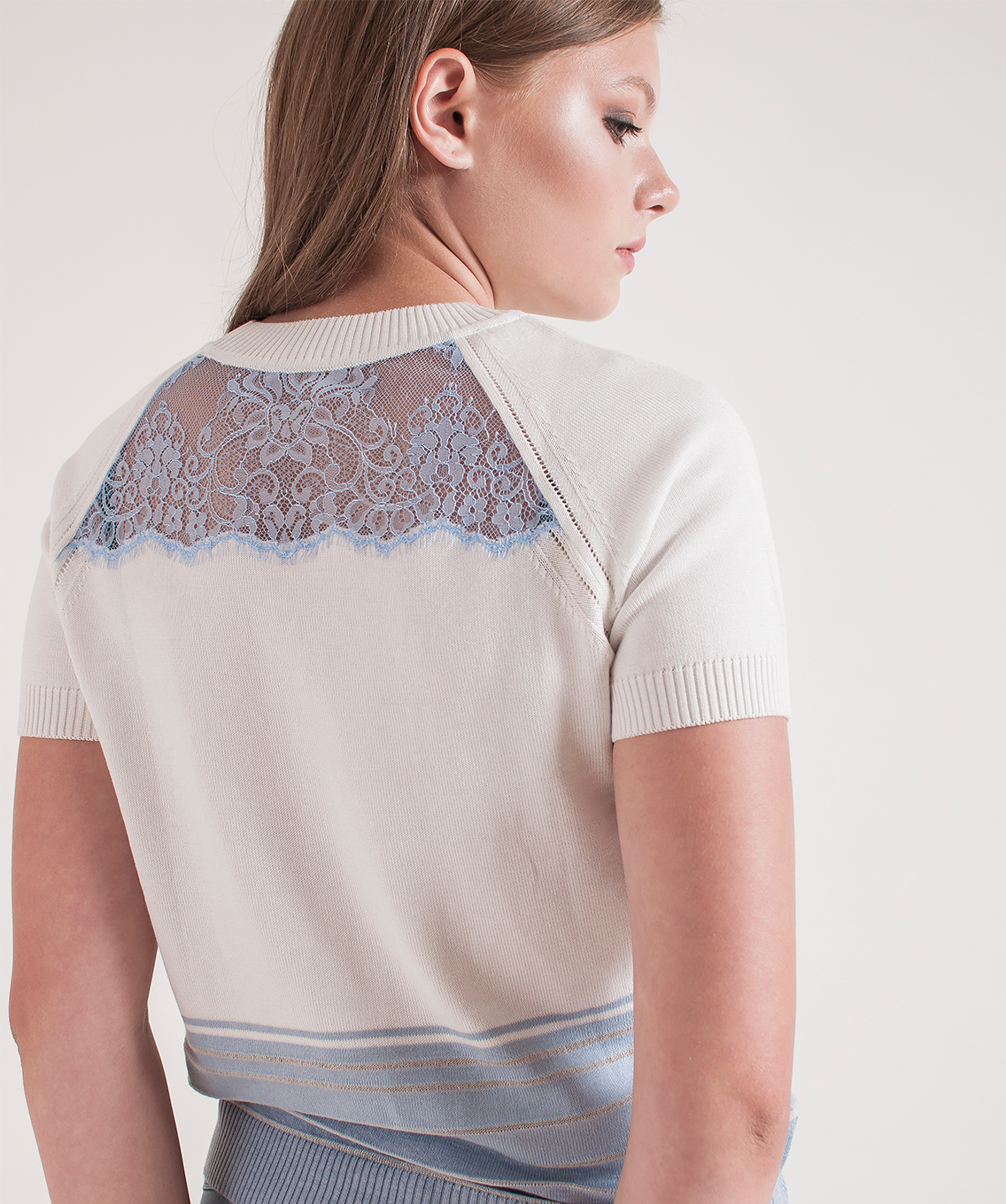 Джемпер прямого кроя. Короткие рукава реглан с ажурными элементами вдоль линии шва, круглый вырез горловины. Кружевная вставка на спинке.