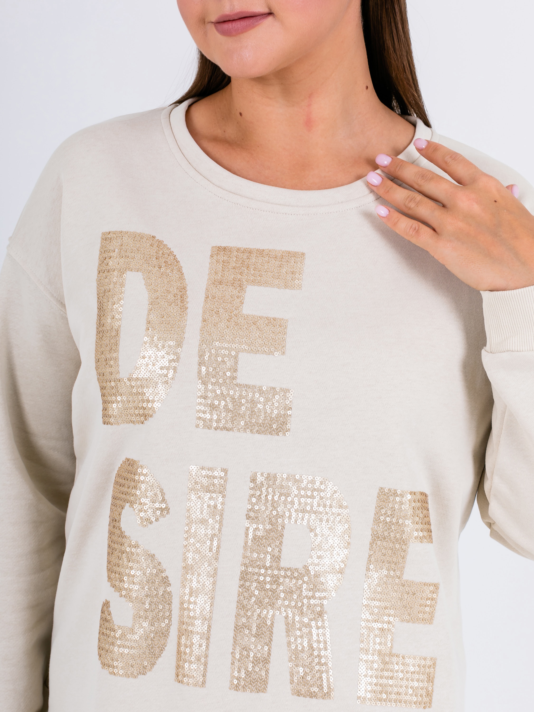 Свитшот прямого силуэта средней длины из легкого 100% хлопка. По переду выполнена эффектная вышивка пайетками. Низ обработан кулиской с резинкой и металлическим фиксатором, для регулировки объема. Длинные втачные рукава с манжетами. Круглый вырез горловины.