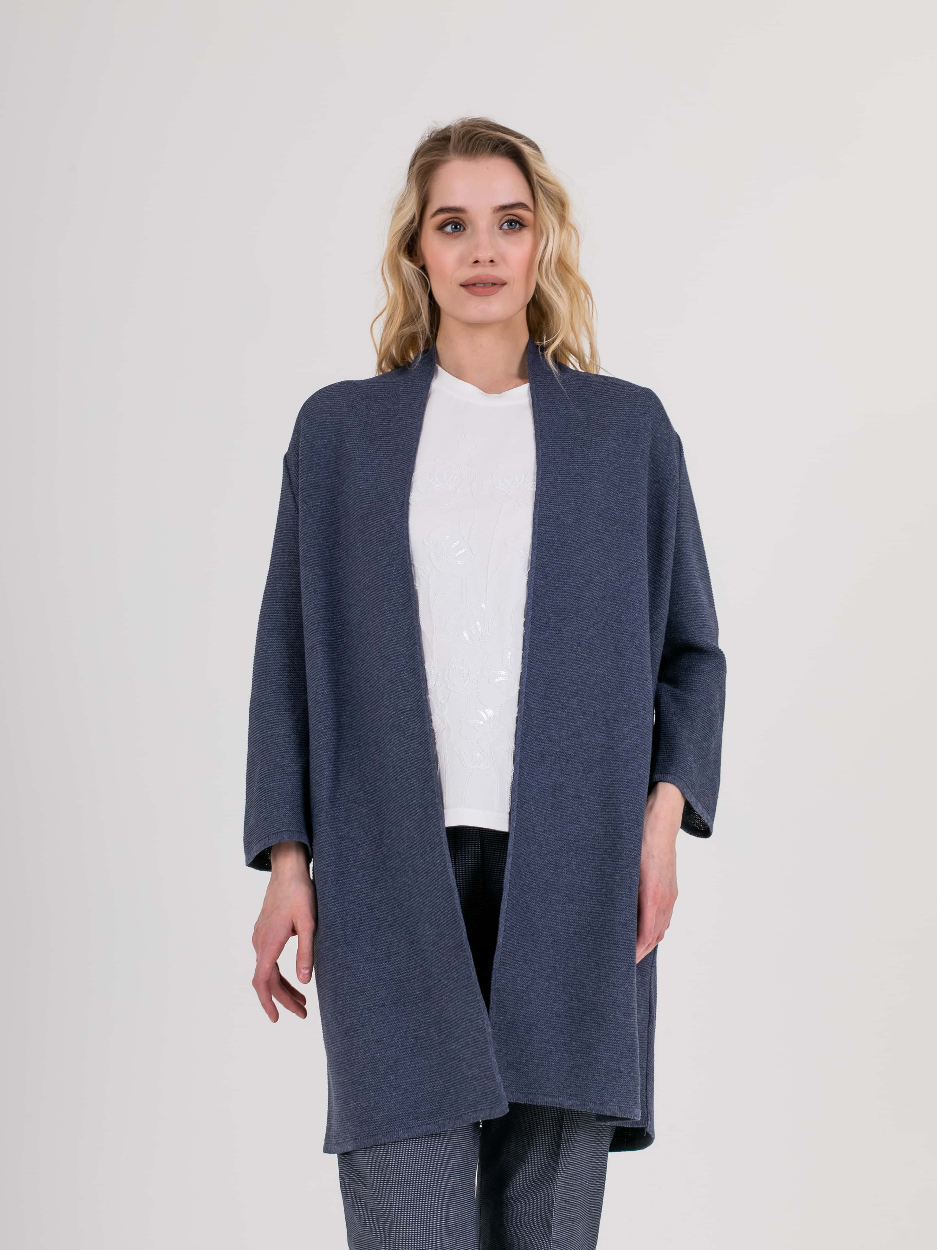На сайте указаны российские размеры. Кардиган прямого силуэта длиной до середины бедер, из легкого хлопка с добавлением полиакрилонитрила. На спинке выполнен эффектный геометрический узор. Длинные втачные рукава со спущенной линией плеча. Горловина обработана небольшой стойкой.