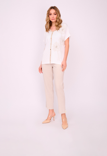 На сайте указаны российские размеры. Трикотажный прямой белый пуловер с V-образным вырезом, с коротким рукавом, с золотистыми вставками и с золотистым цветочным рисунком, с декоративными пуговицами и стразами. Длина по спинке: 63 см. Рост модели: 175 см.