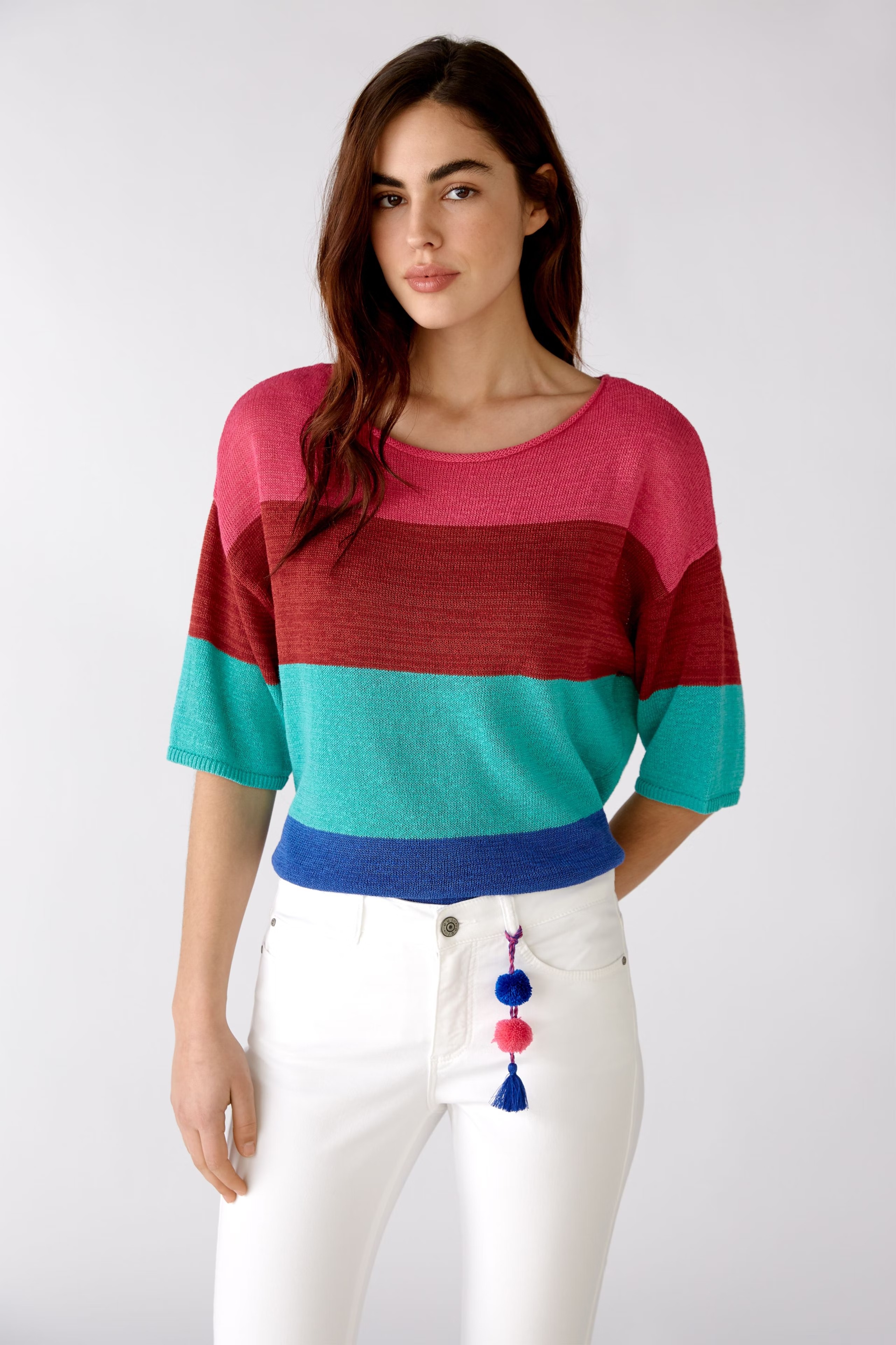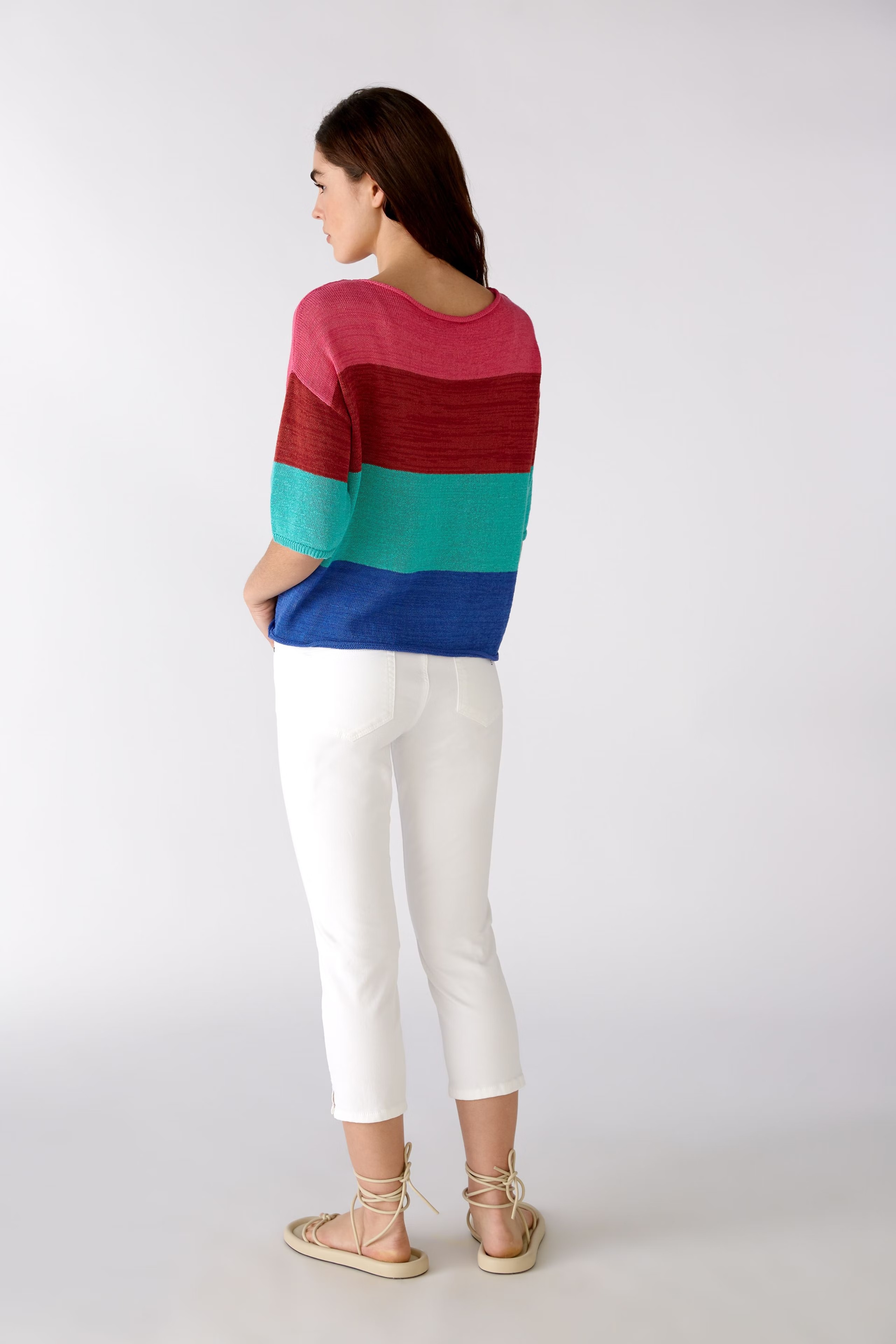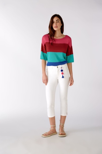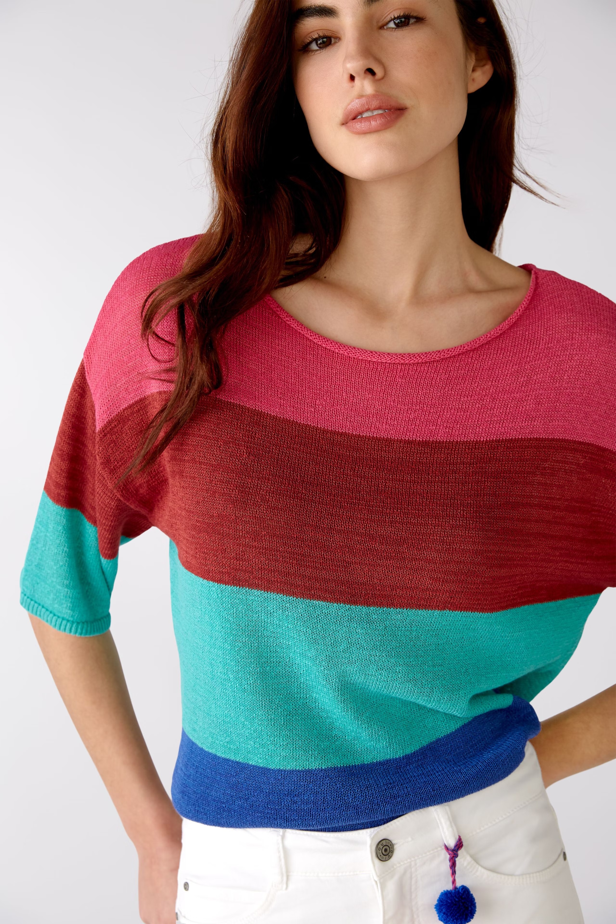 Немецкий бренд. На сайте указаны Российские размеры. Свободный фасон со спущенными плечами и короткими рукавами. Летний вырез-лодочка с закругленными краями. Узкие ребристые манжеты на руке. Закрученный край на кромке.