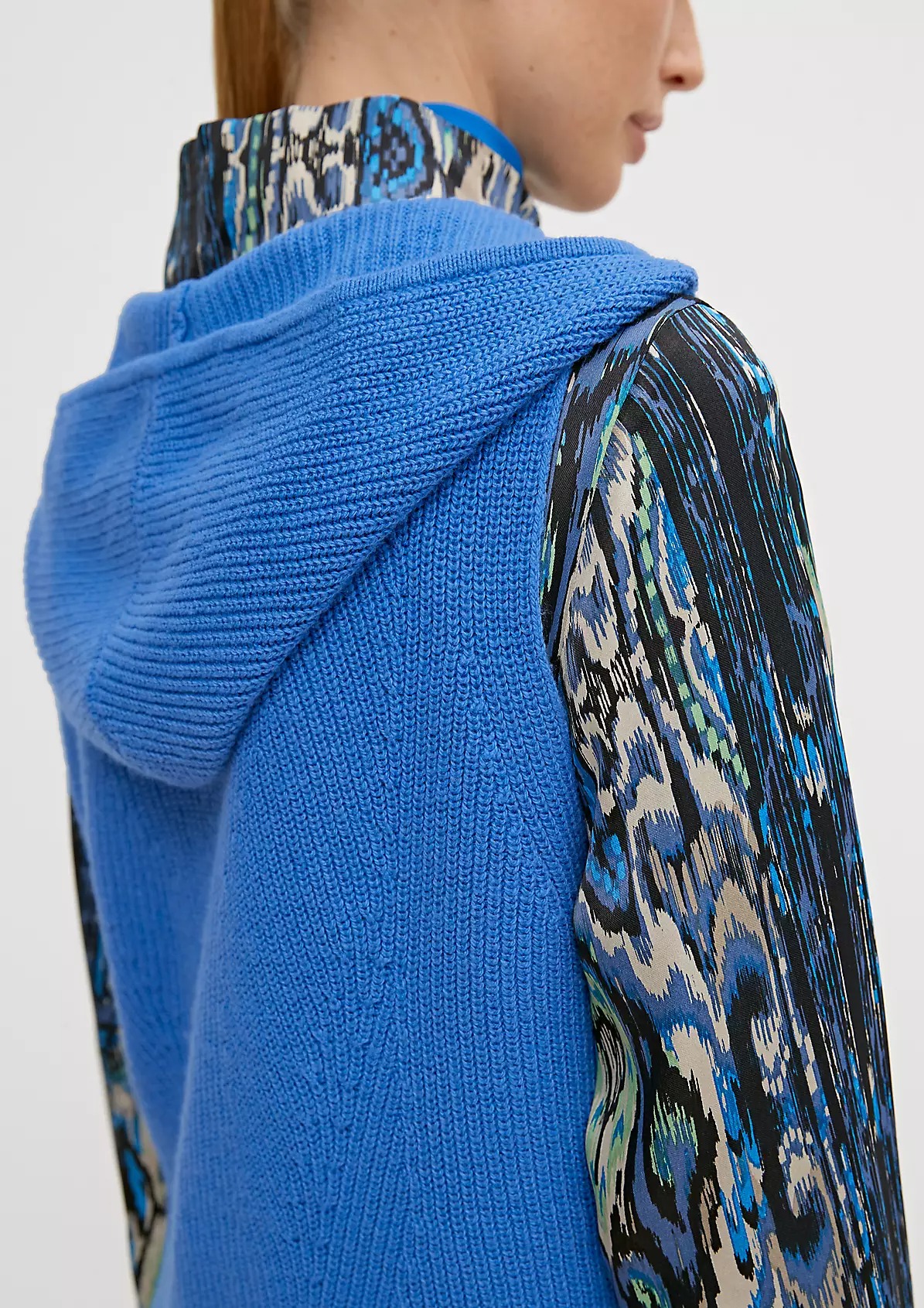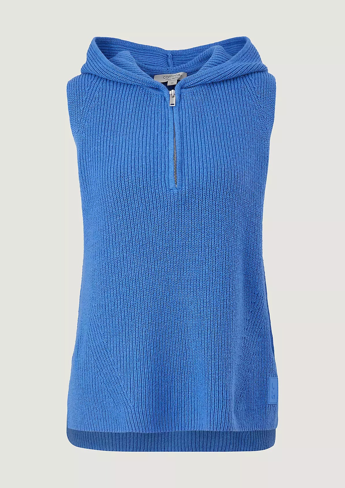 На сайте указаны российские размеры. Трикотажный жилет с капюшоном и удлиненной спинкой. Подол с разрезом сбоку. Застежка на молнию. Длина спины 63 см в размере 42 Рост модели 178 см.