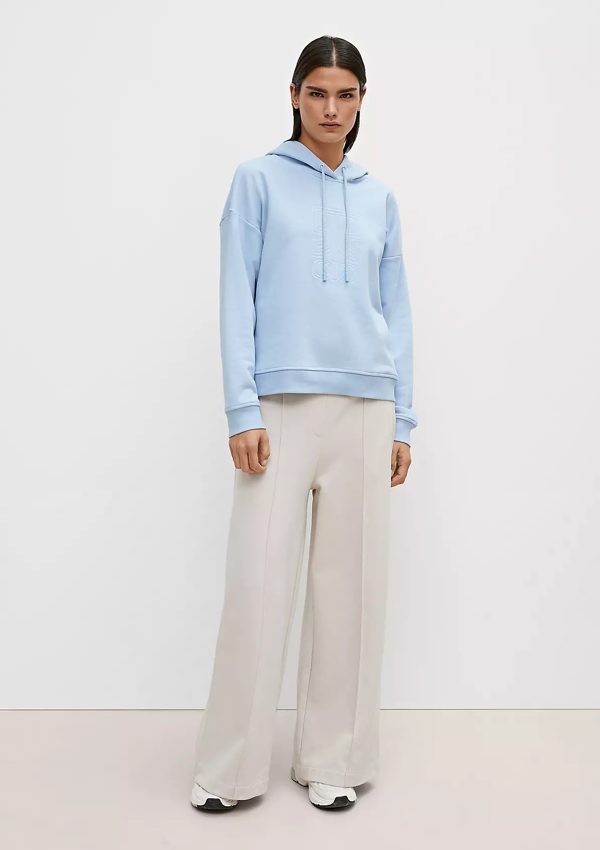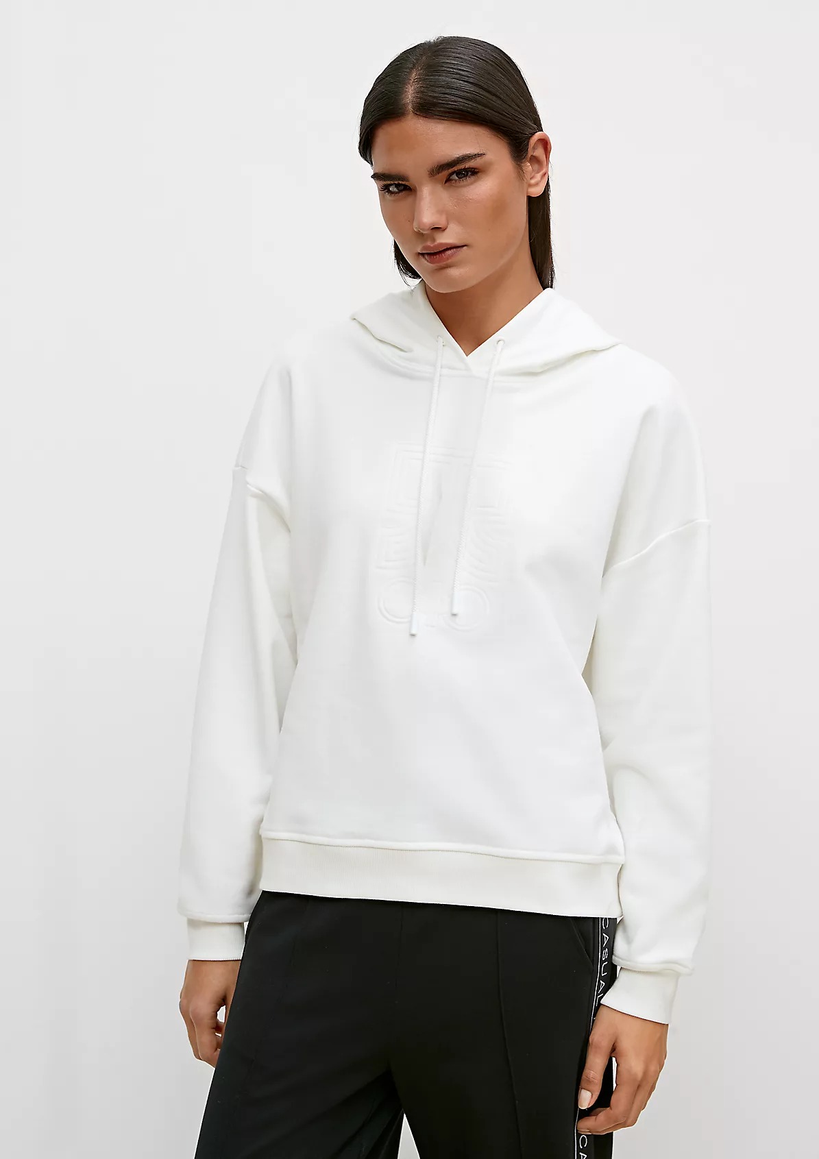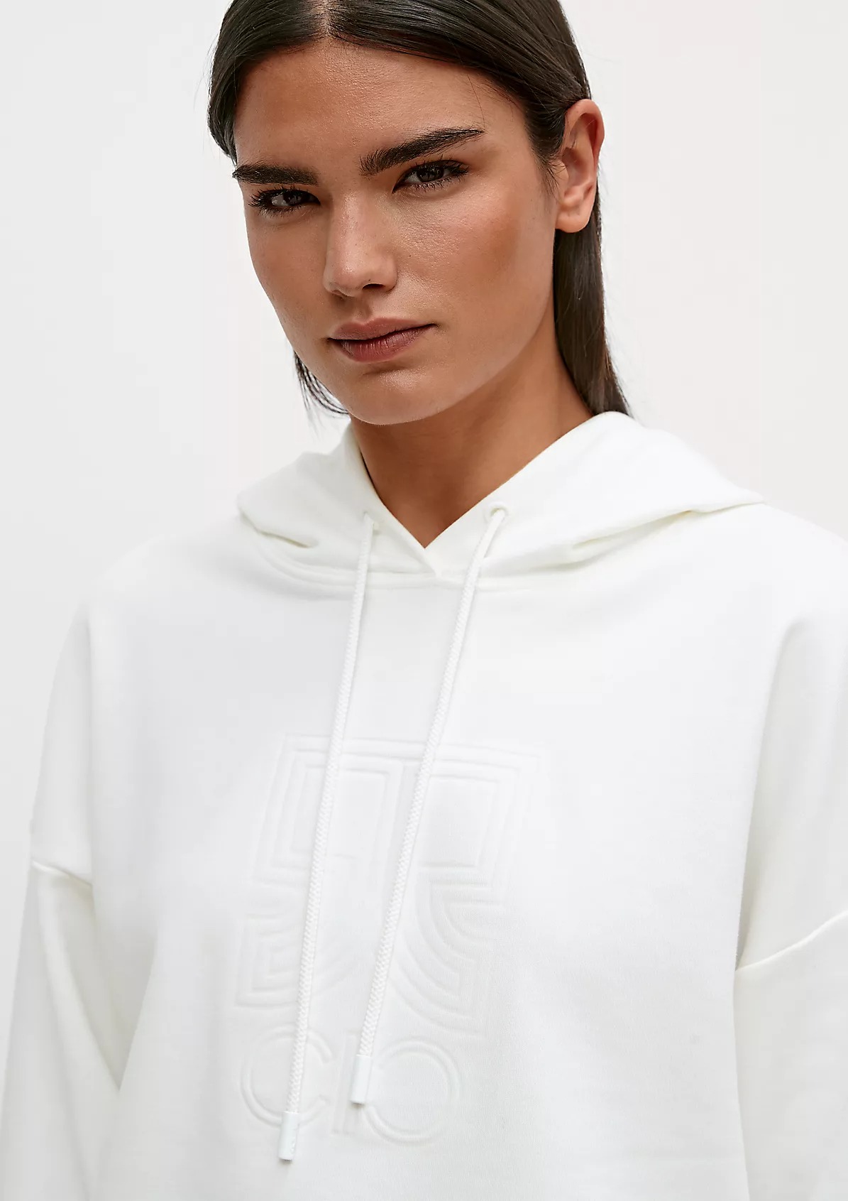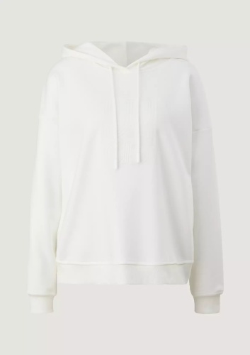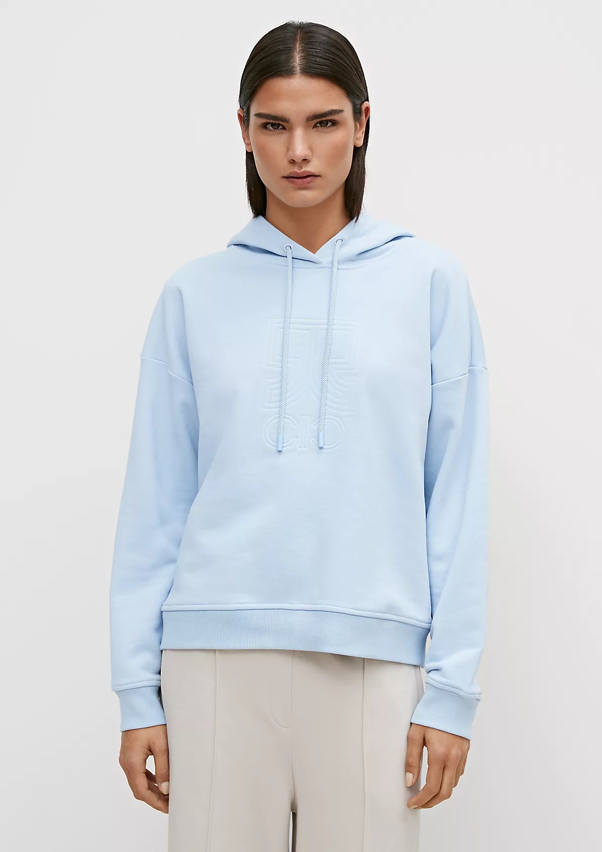 На сайте указаны российские размеры. Толстовка с капюшоном и рельефным принтом. Длинные рукава с ребристыми манжетами. Подол с ребристой отделкой. Длина спины 59 см в размере 42. Рост модели 177 см.