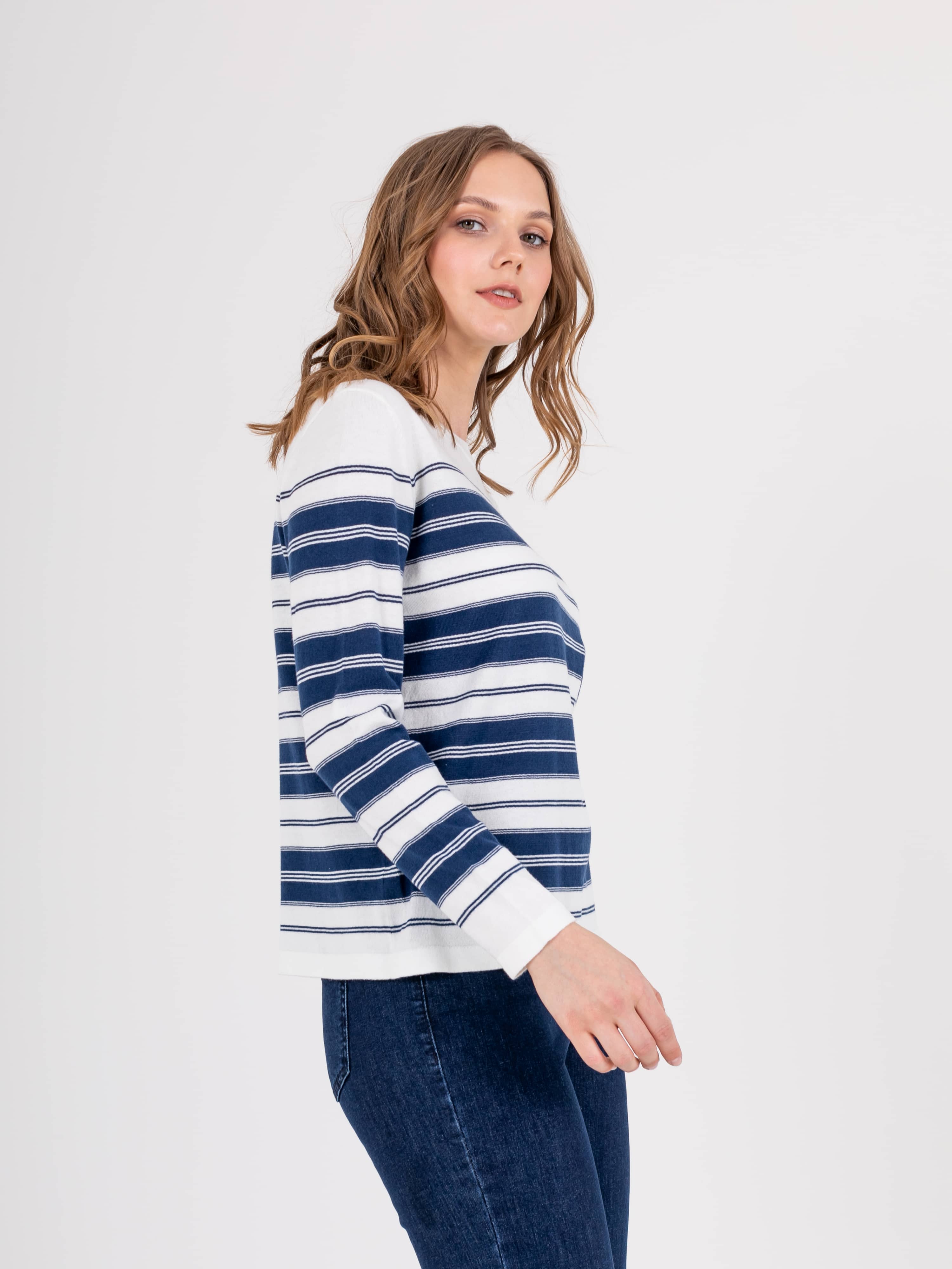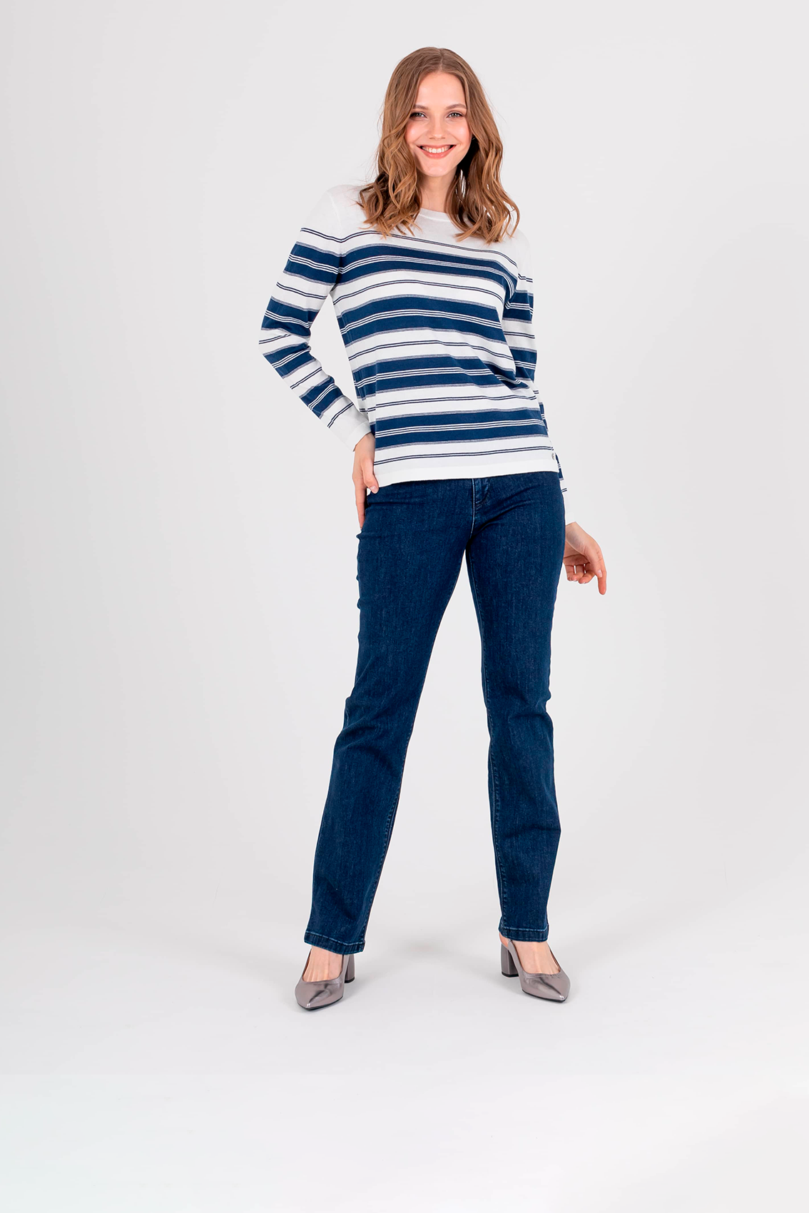 Джемпер средней длины прямого силуэта из легкого хлопка с добавлением акрила, дизайнерская особенность модели – рисунок в полоску. Длинные втачные рукава. Круглый вырез горловины.
