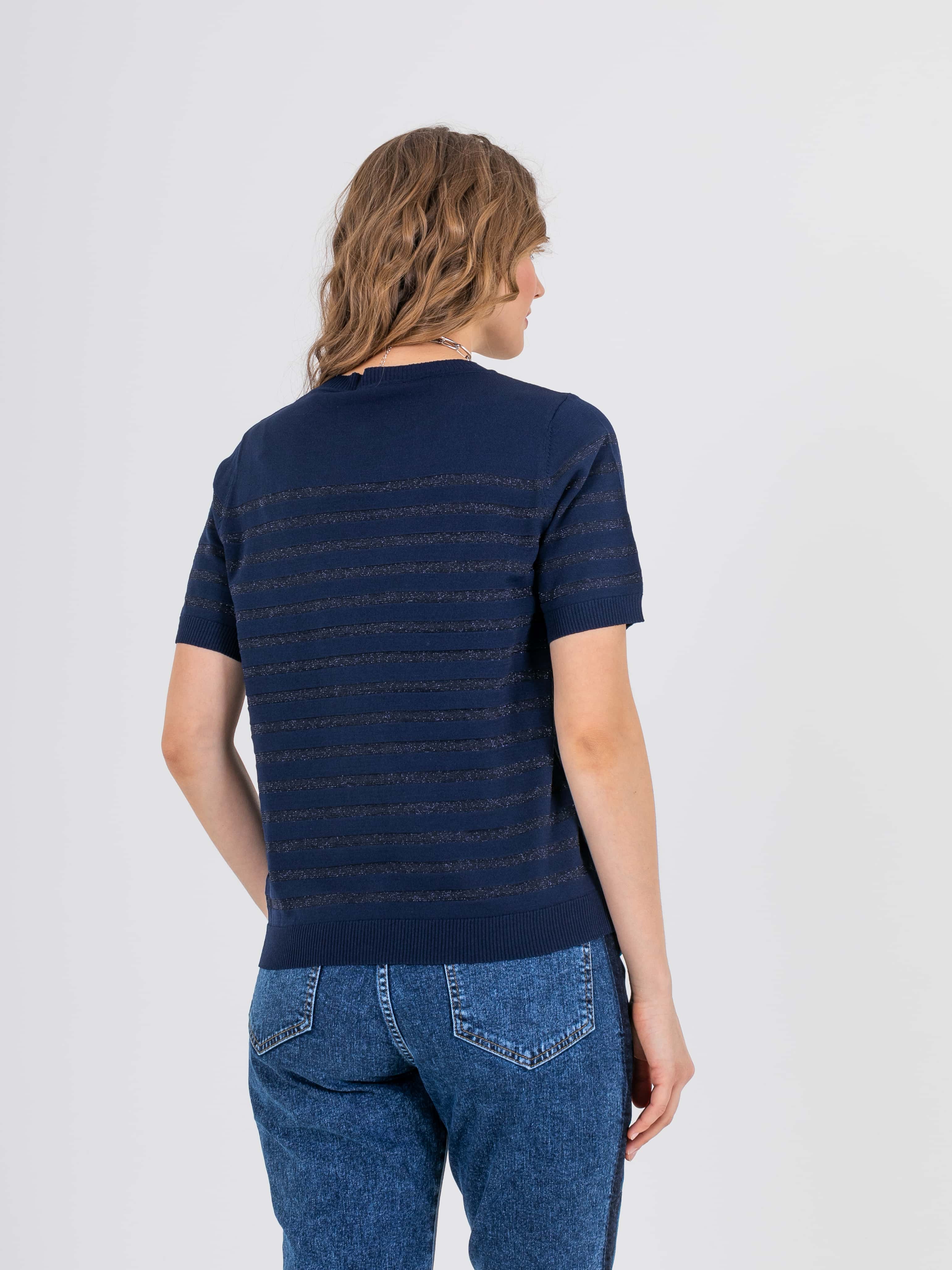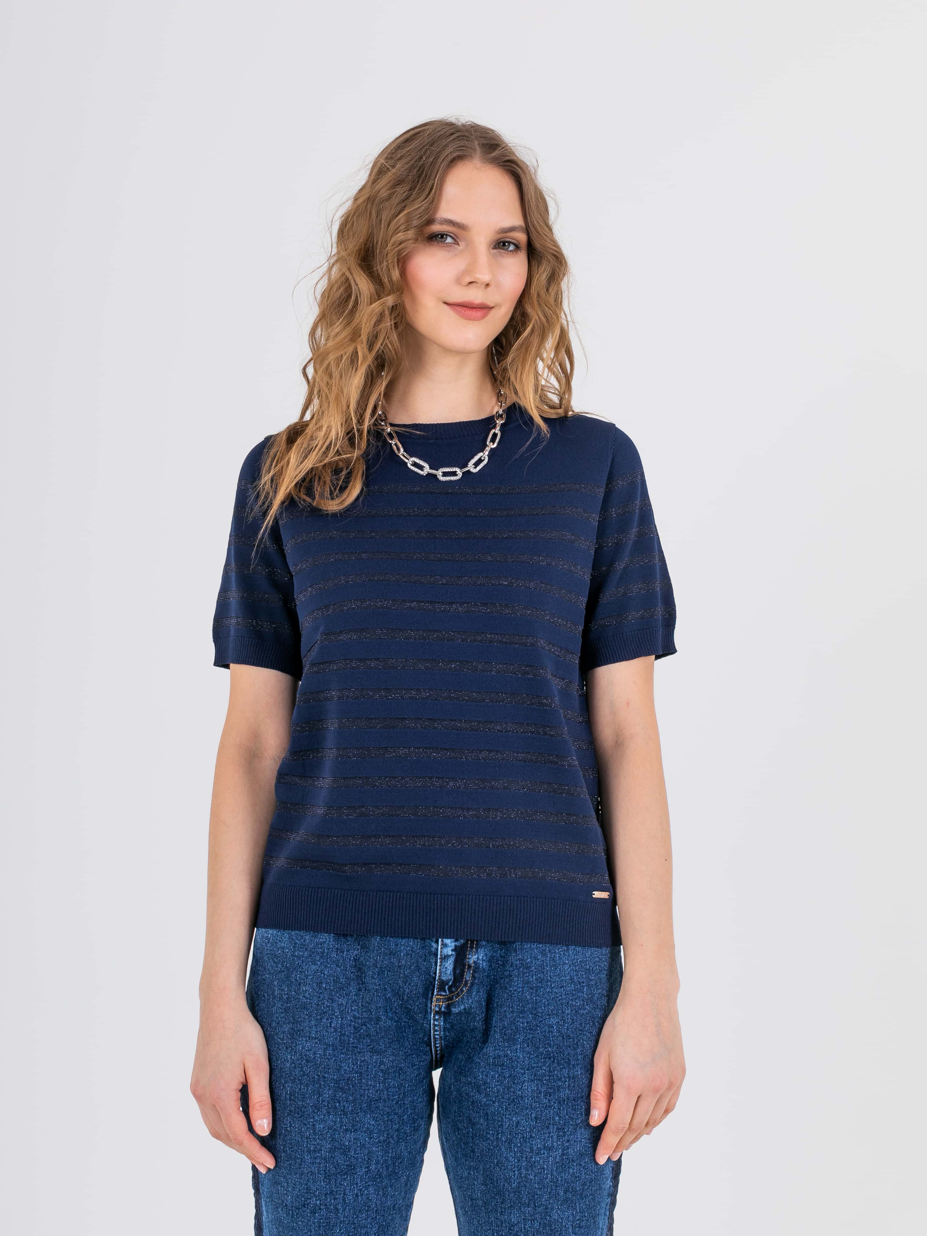 Укороченная футболка прямого силуэта в полоску из легкой, мягкой вискозы с добавлением эластана. Перед и спинка по низу обработаны манжетой. Укороченные втачные рукава с манжетами. Круглый вырез горловины, обработанный трикотажной косой бейкой.