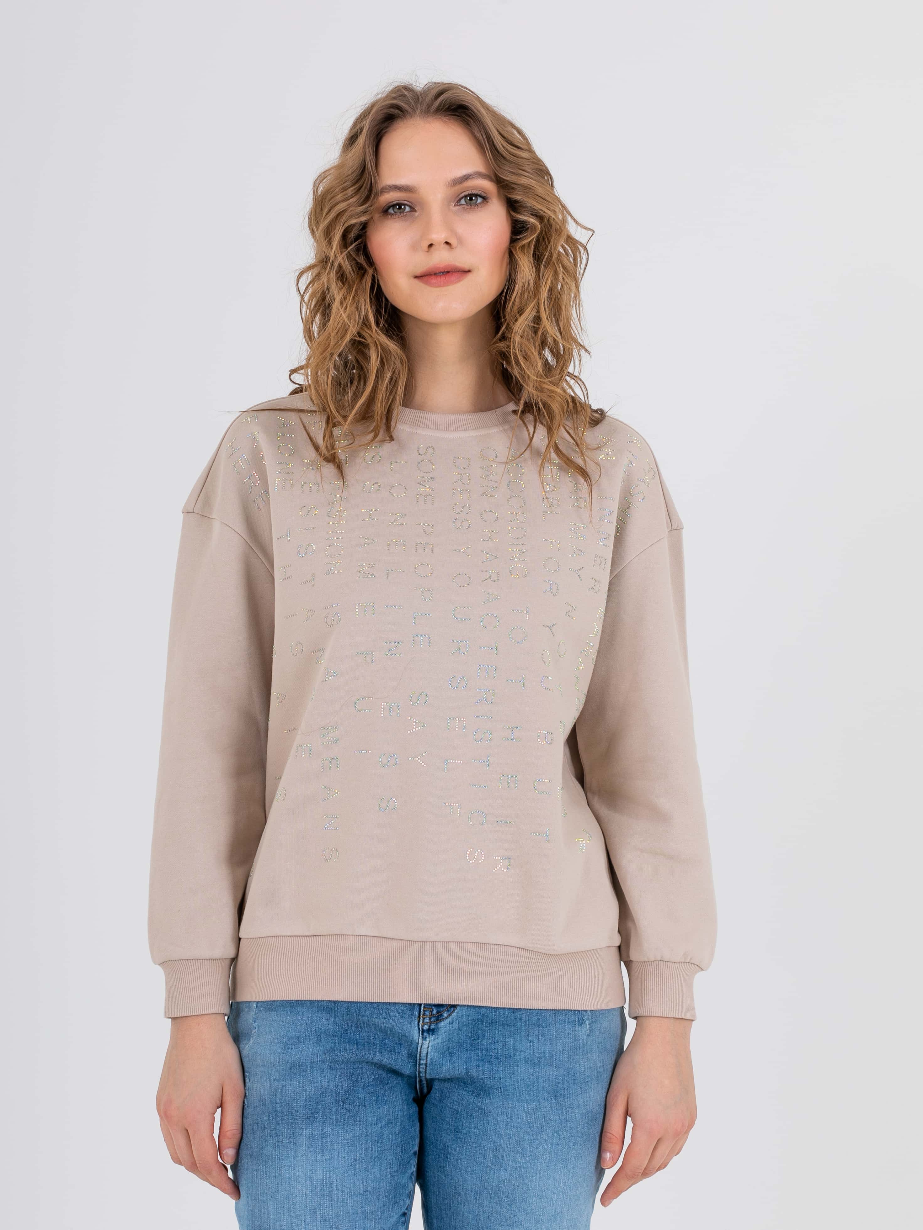 Свитшот прямого силуэта средней длины из легкого хлопка с добавлением полиэстера. Перед и спинка по низу обработаны манжетой. Перед украшен аппликациями в виде надписей из страз. Длинные втачные рукава со спущенной линией плеча и манжетами. Круглый вырез горловины.