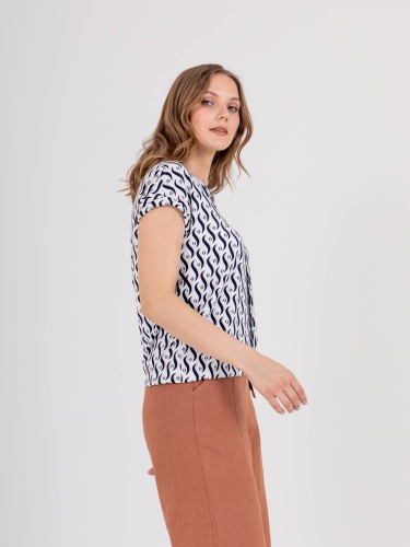 Футболка средней длины прямого силуэта из легкой, мягкой вискозы с добавлением эластана, дизайнерская особенность модели – яркий принт. Короткие цельнокроеные рукава с манжетами. Круглый вырез горловины с разрезом, обработан косой бейкой, которая переходит в декоративную планку по переду.