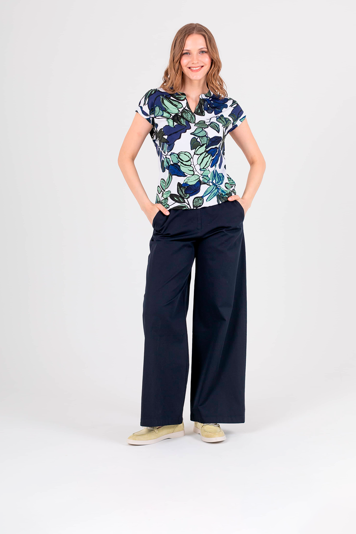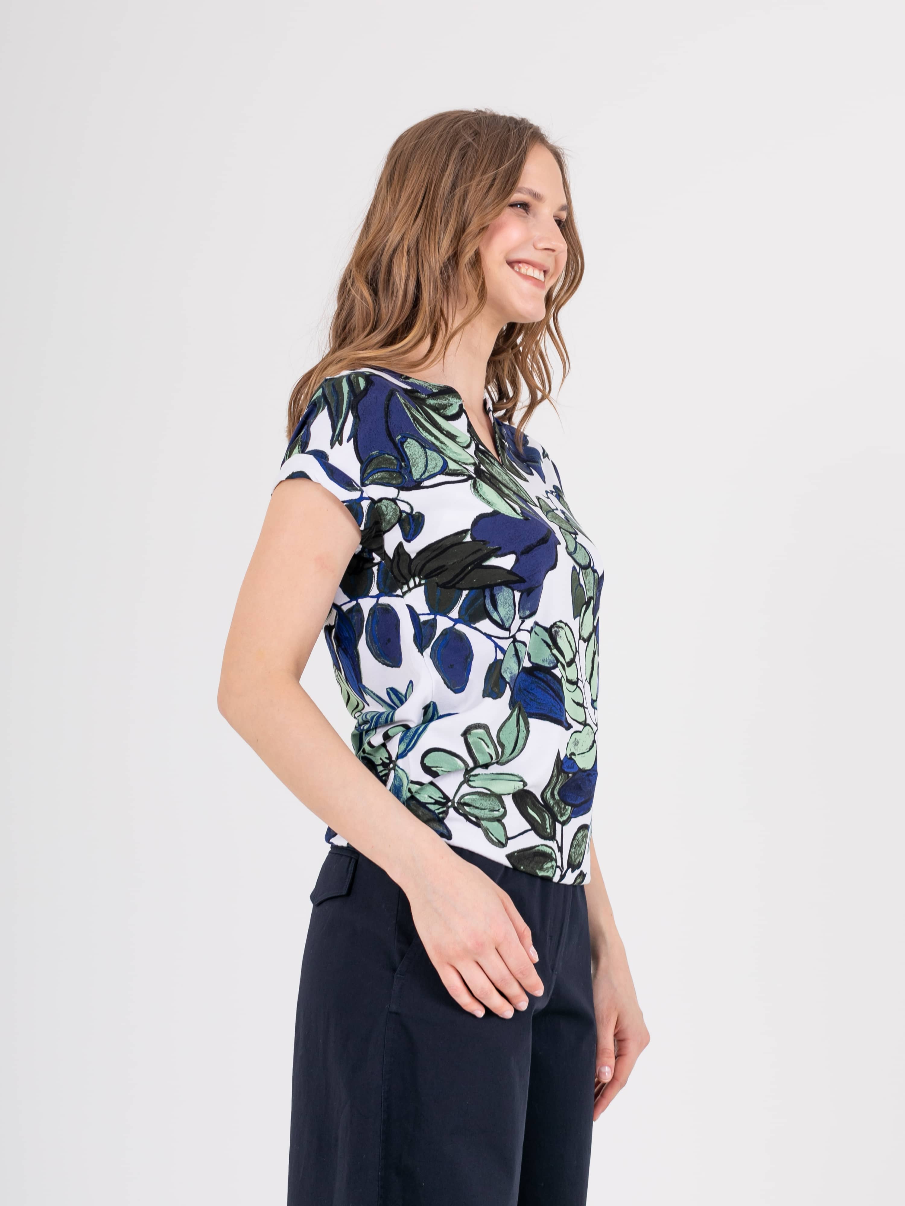 Футболка средней длины прямого силуэта из легкой, мягкой вискозы с добавлением эластана, дизайнерская особенность модели – эффектный растительный принт. Короткие цельнокроеные рукава с манжетами. Круглый вырез горловины с разрезом, обработан косой бейкой.
