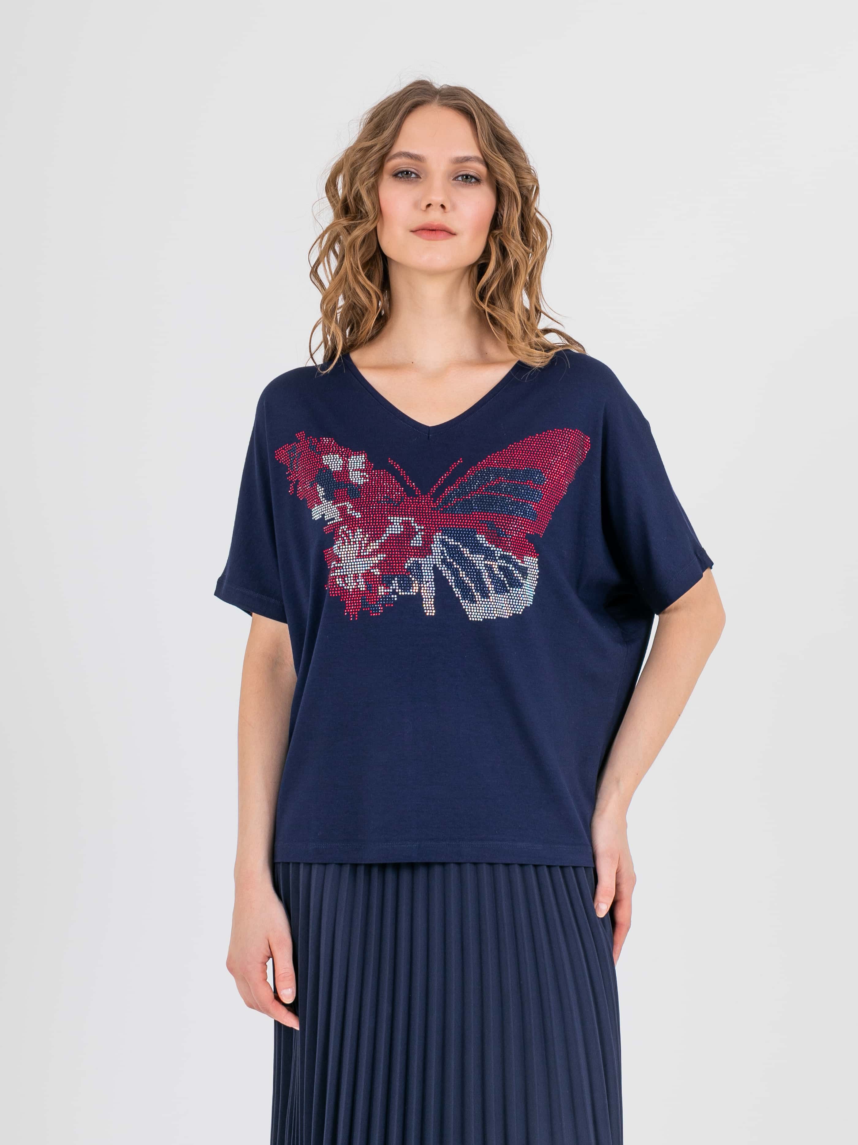 На сайте указаны российские размеры. Оверсайз футболка средней длины прямого силуэта из легкой, мягкой вискозы с добавлением эластана. По переду выполнена яркая аппликация из страз. Укороченные цельнокроеные рукава. V-образный вырез горловины, обработанный трикотажной косой бейкой.