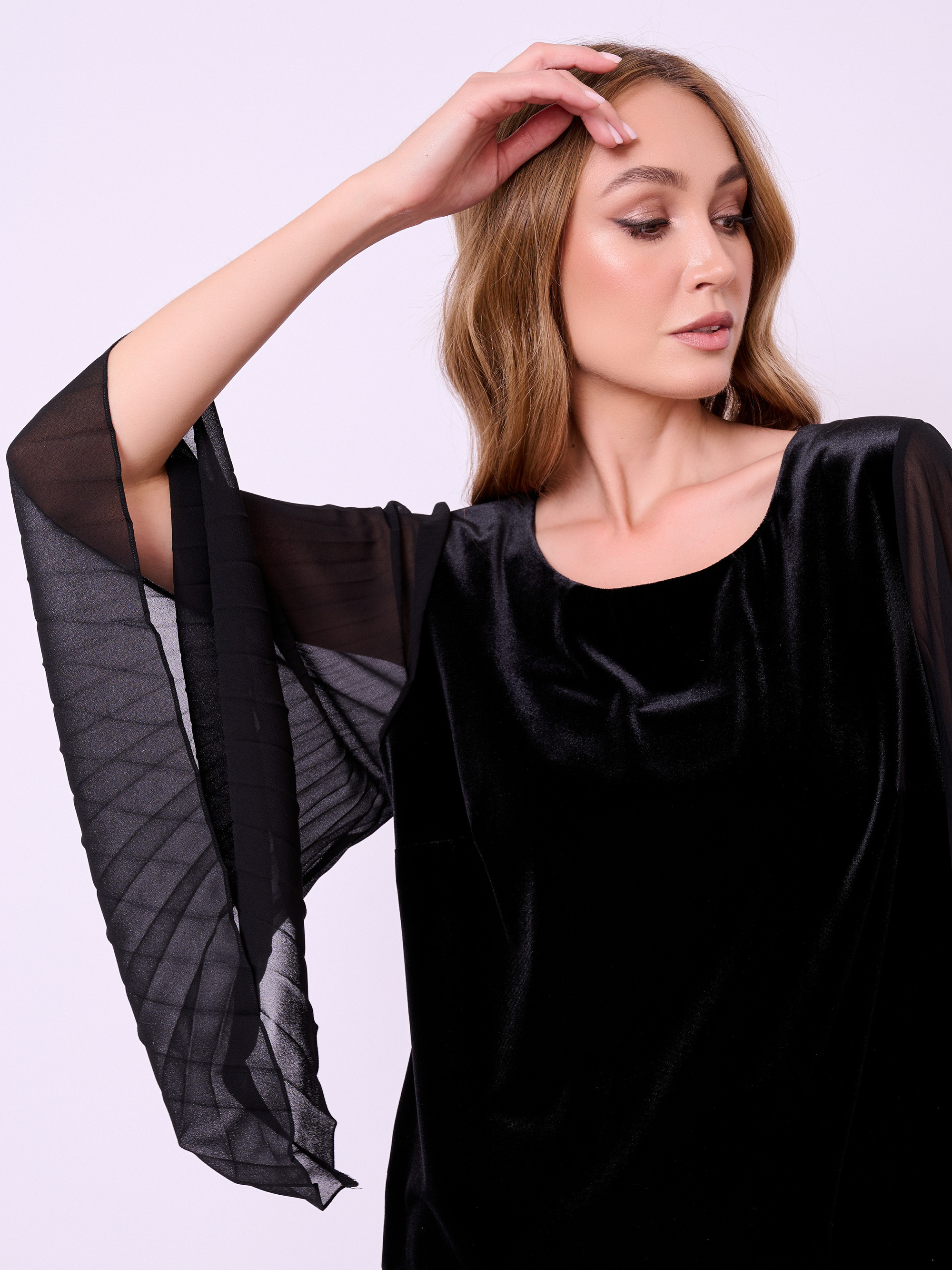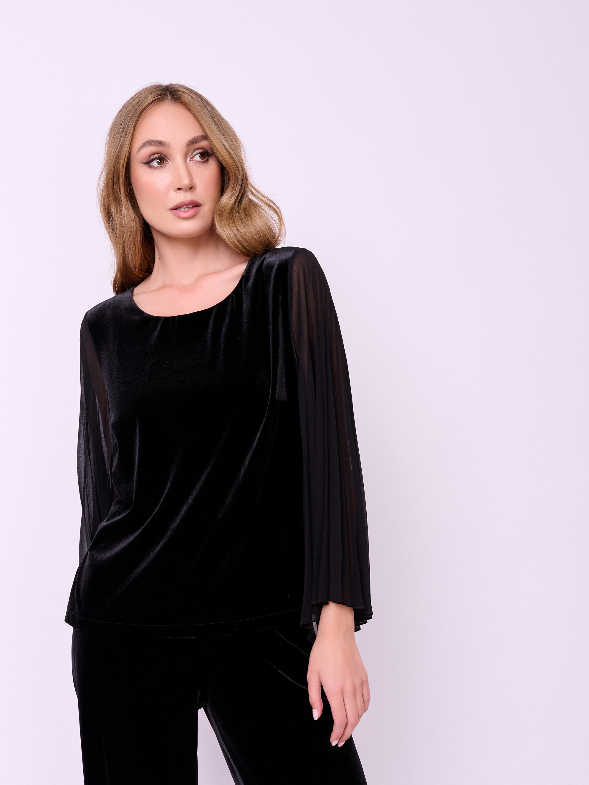 Комбинированная блуза из бархатного трикотажа с плиссированными рукавами асимметричного кроя из шифона, округлой горловиной и боковыми разрезами. Длина по спинке: 56 см.