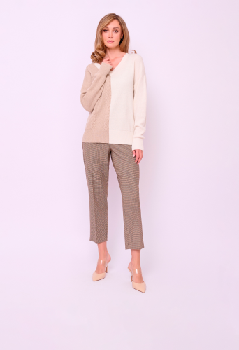 Пуловер прямого покроя в стиле «колор блок» из смесовой шерсти и кашемира с V-образным вырезом горловины, длинными рукавами-реглан и рисунком «косы». Длина по спине: 63 см.