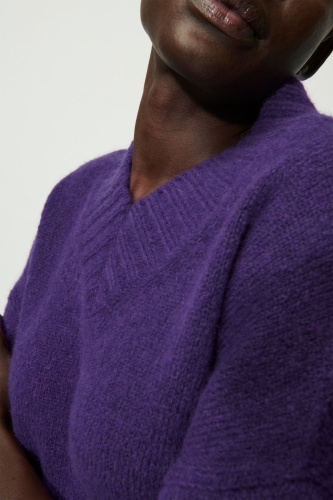 Легкий пуловер с V-образным вырезом из высококачественной итальянской полушерстяной ткани. Заниженные плечи помогают создать повседневный образ.