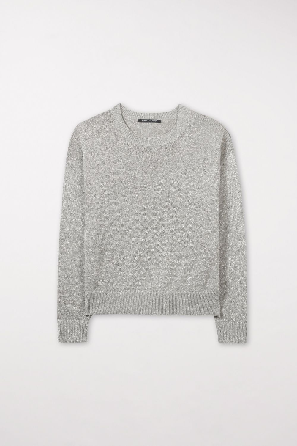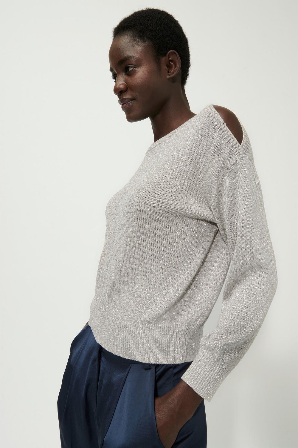 Повседневный свитер с приспущенными плечами и изысканным вырезом. Металлизированная переливающаяся ленточная пряжа придает этому свитеру гламурный вид.