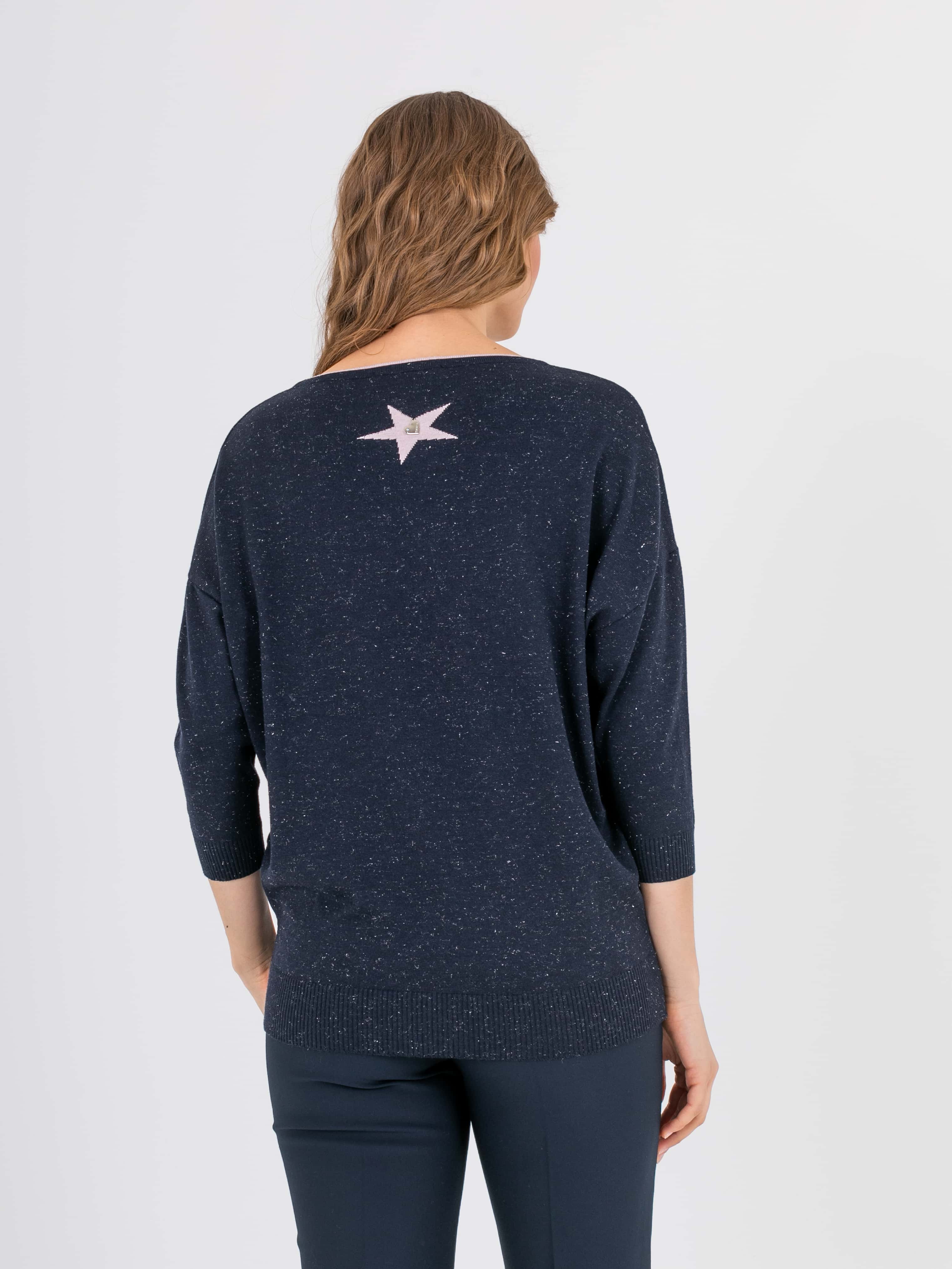 Джемпер прямого силуэта средней длины из мягкой вискозы с добавлением эластана и люрекса. Перед и спинка по низу обработаны манжетой. Перед выполнен из фактурного трикотажа. По спинке расположен нежный рисунок в виде звезды. Рукава втачные ¾ со спущенной линией плеча и манжетами. Круглый вырез горловины.