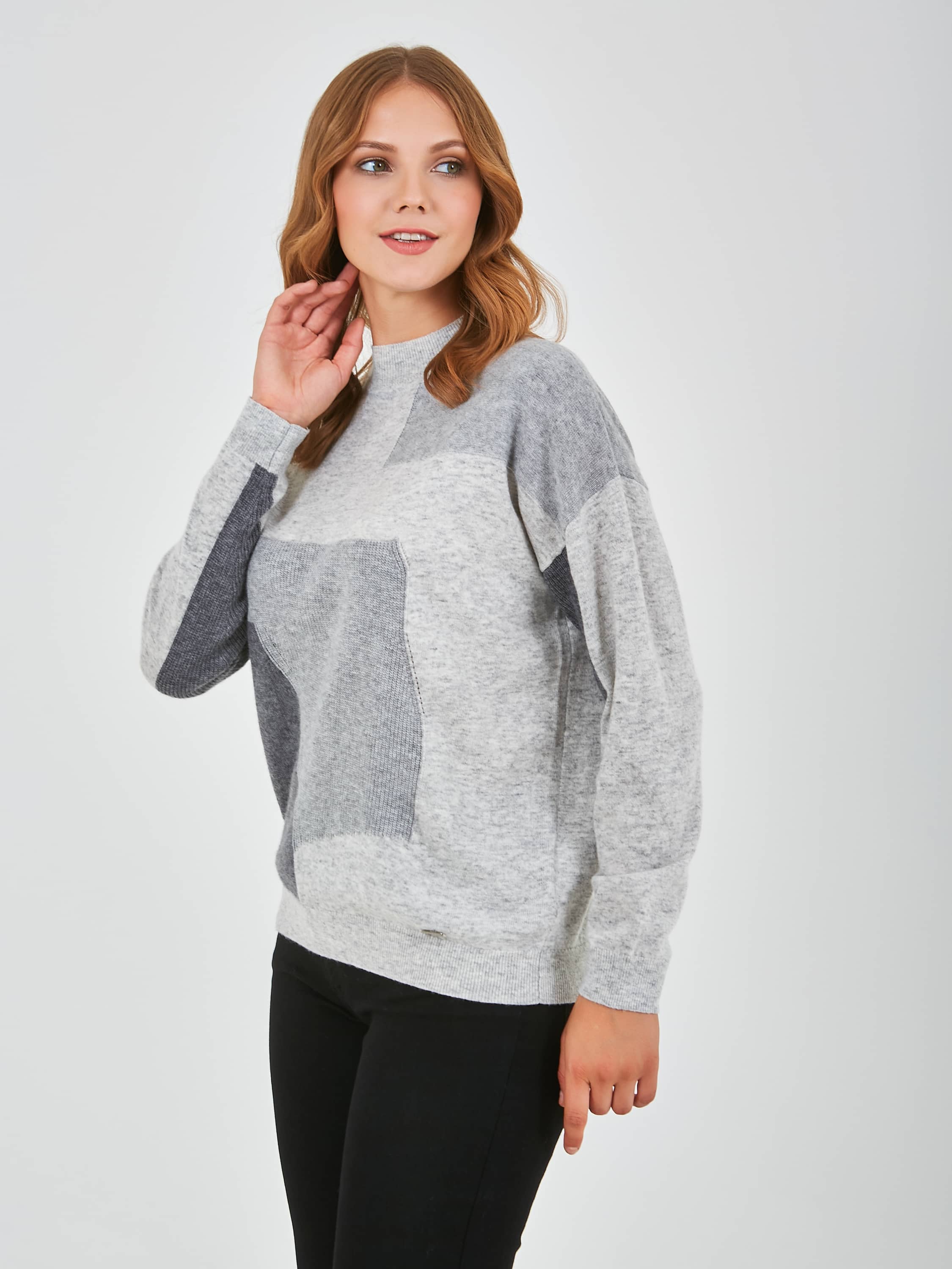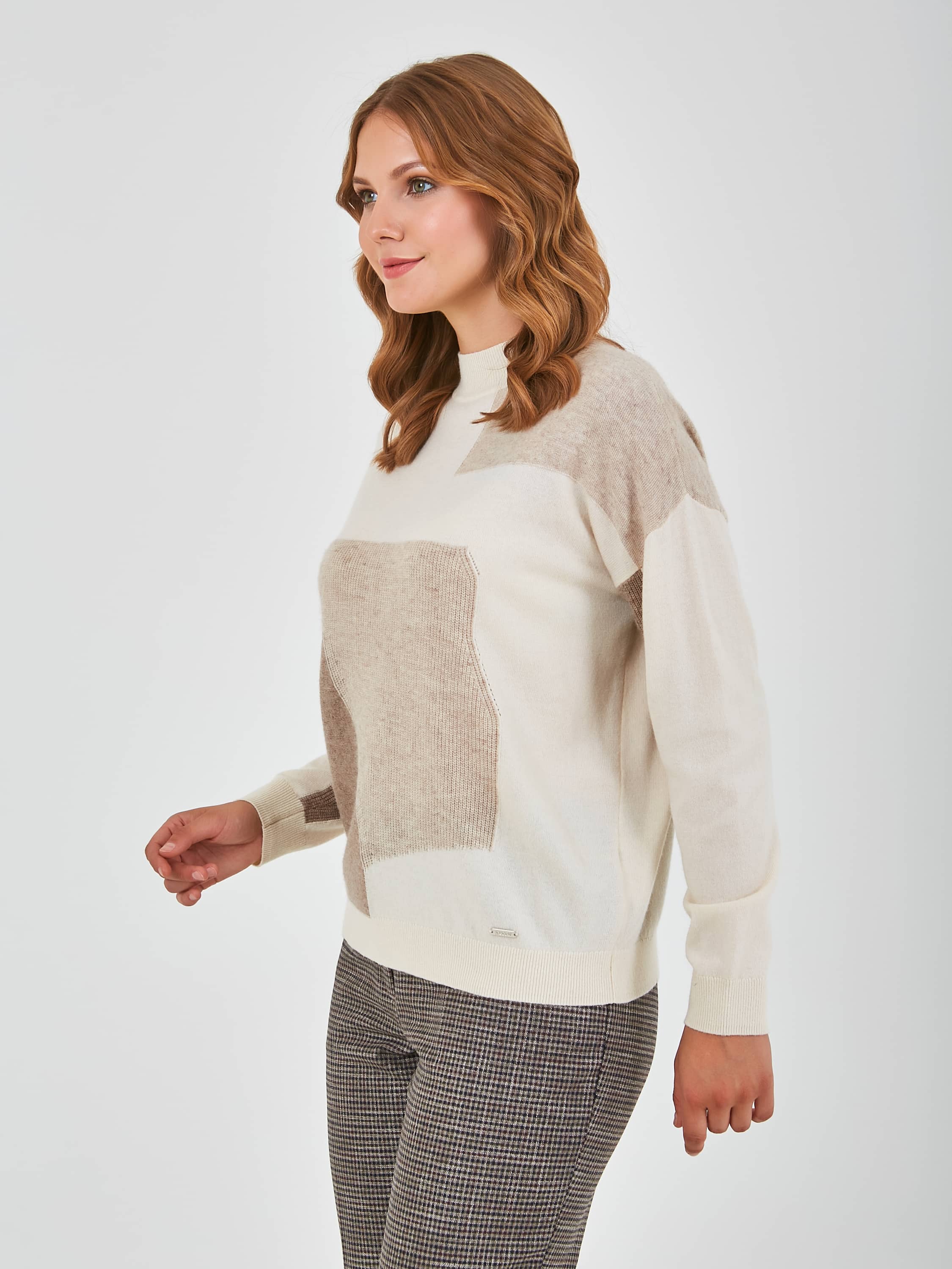 Джемпер средней длины прямого силуэта из мягкой шерсти с добавлением полиэстера и нейлона, дизайнерская особенность модели – геометрический рисунок и перфорированный трикотаж. Перед и спинка по низу обработаны манжетой. Длинные втачные рукава со спущенной линией плеча и манжетами. Воротник стойка.