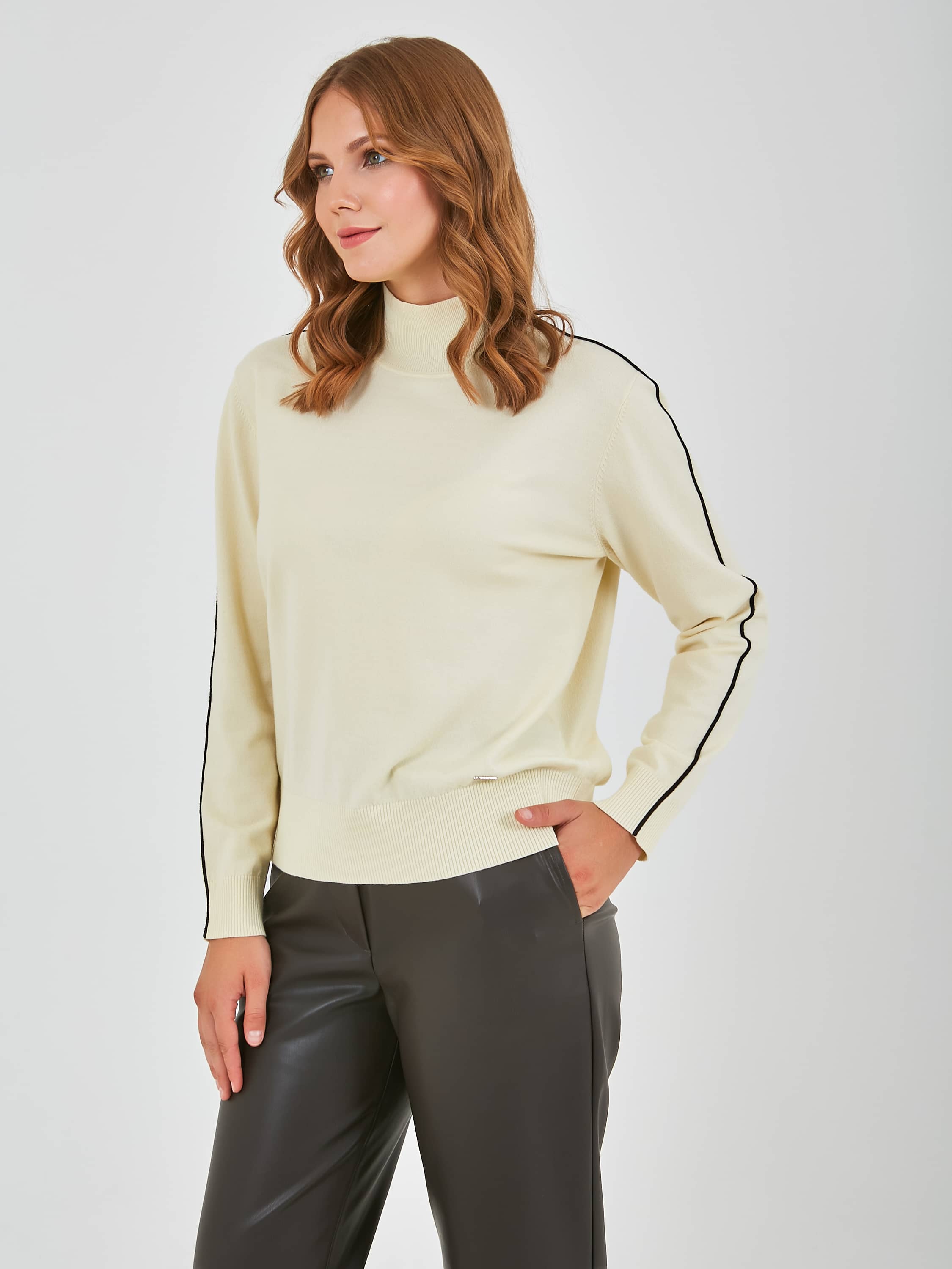 Джемпер средней длины прямого силуэта из легкого хлопка с добавлением вискозы, акрила и полиэстера, дизайнерская особенность модели - контрастный кант по всей длине рукава. Перед и спинка по низу обработаны манжетой. Длинные втачные рукава с манжетами. Воротник «хомут».