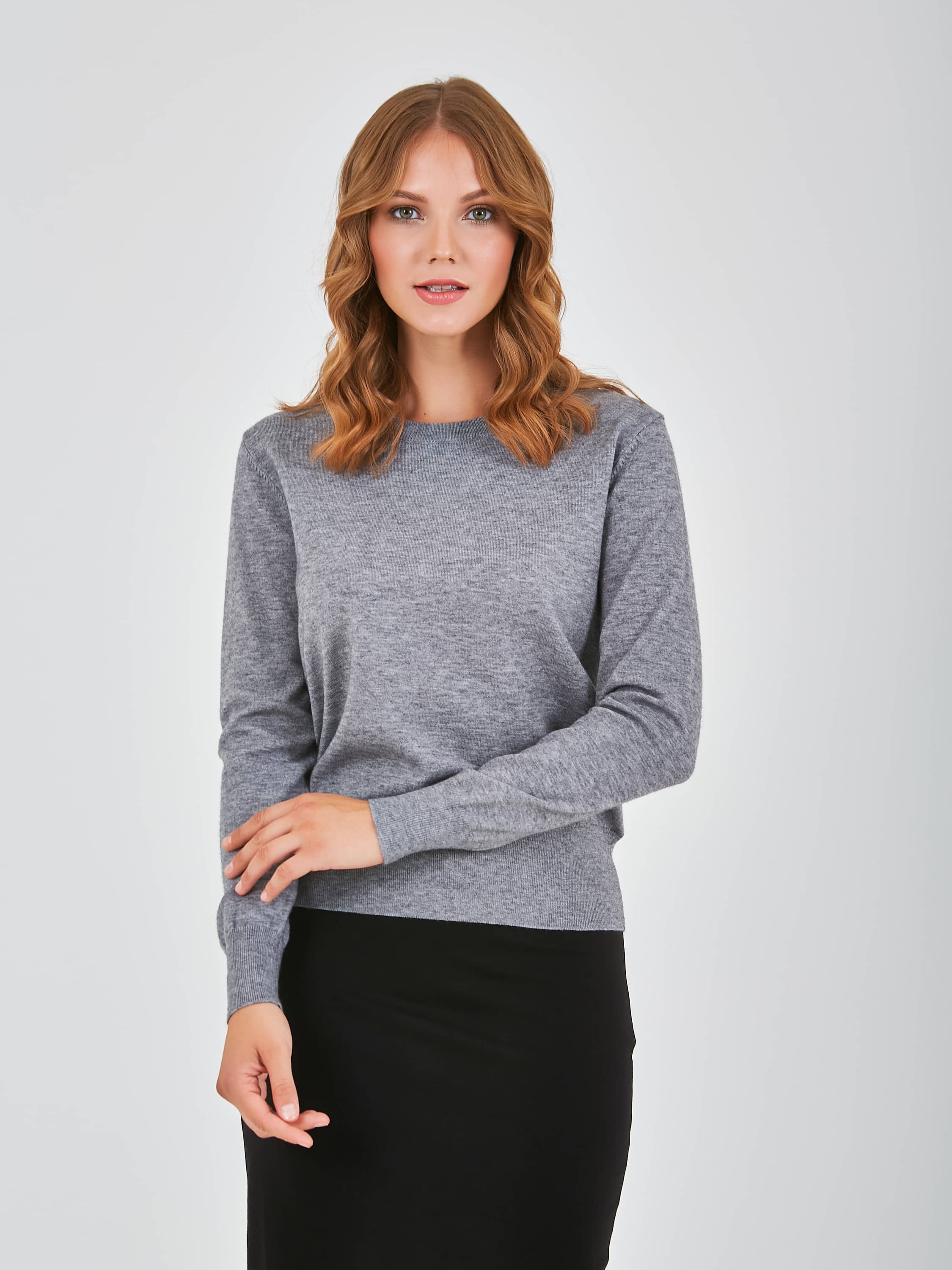 Джемпер средней длины прямого силуэта из мягкой вискозы с добавлением полиэстера и нейлона. Перед и спинка по низу обработаны манжетой. Длинные втачные рукава с манжетами. Круглый вырез горловины.