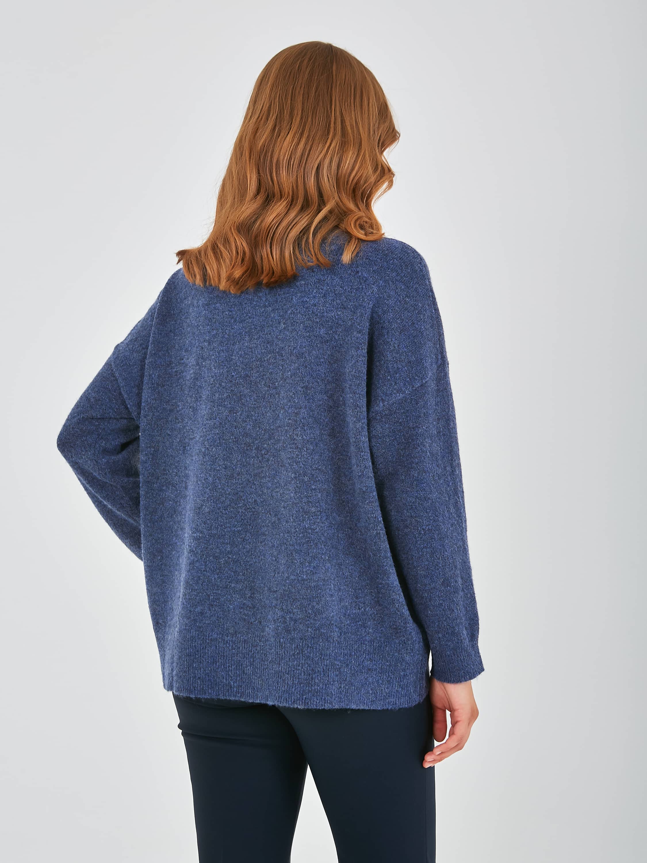 Джемпер средней длины прямого оверсайз силуэта из полиэстера, акрила, с добавлением мягкой шерсти с добавлением нейлона и акрила, дизайнерская особенность модели - эффект "драной" одежды. Перед и спинка по низу обработаны манжетой. Длинные втачные рукава со спущенной линией плеча и манжетами. V-образный вырез горловины.
