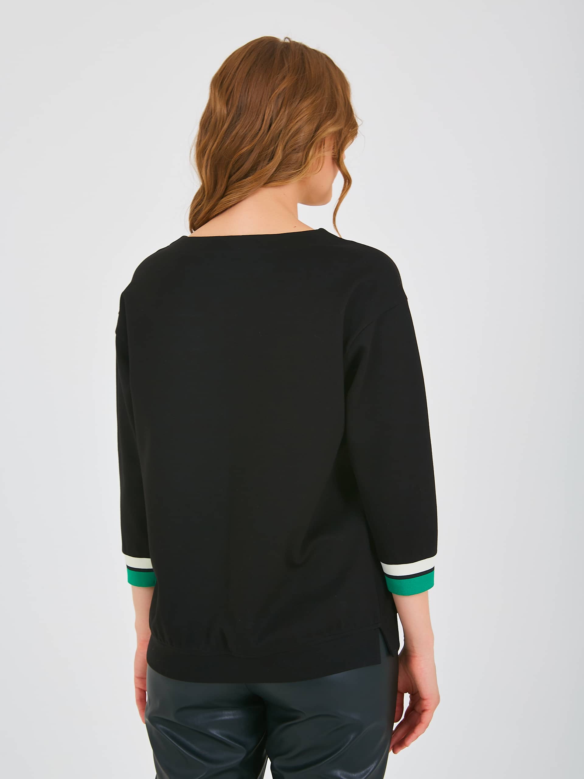 Джемпер средней длины прямого силуэта из мягкой вискозы с добавлением нейлона и лайкры, дизайнерская особенность модели – контрастный геометрический рисунок на манжетах и горловине по переду. Перед и спинка по низу обработаны манжетой с боковыми разрезами. Втачные рукава 3/4 со спущенной линией плеча с манжетами. V-образный вырез горловины.