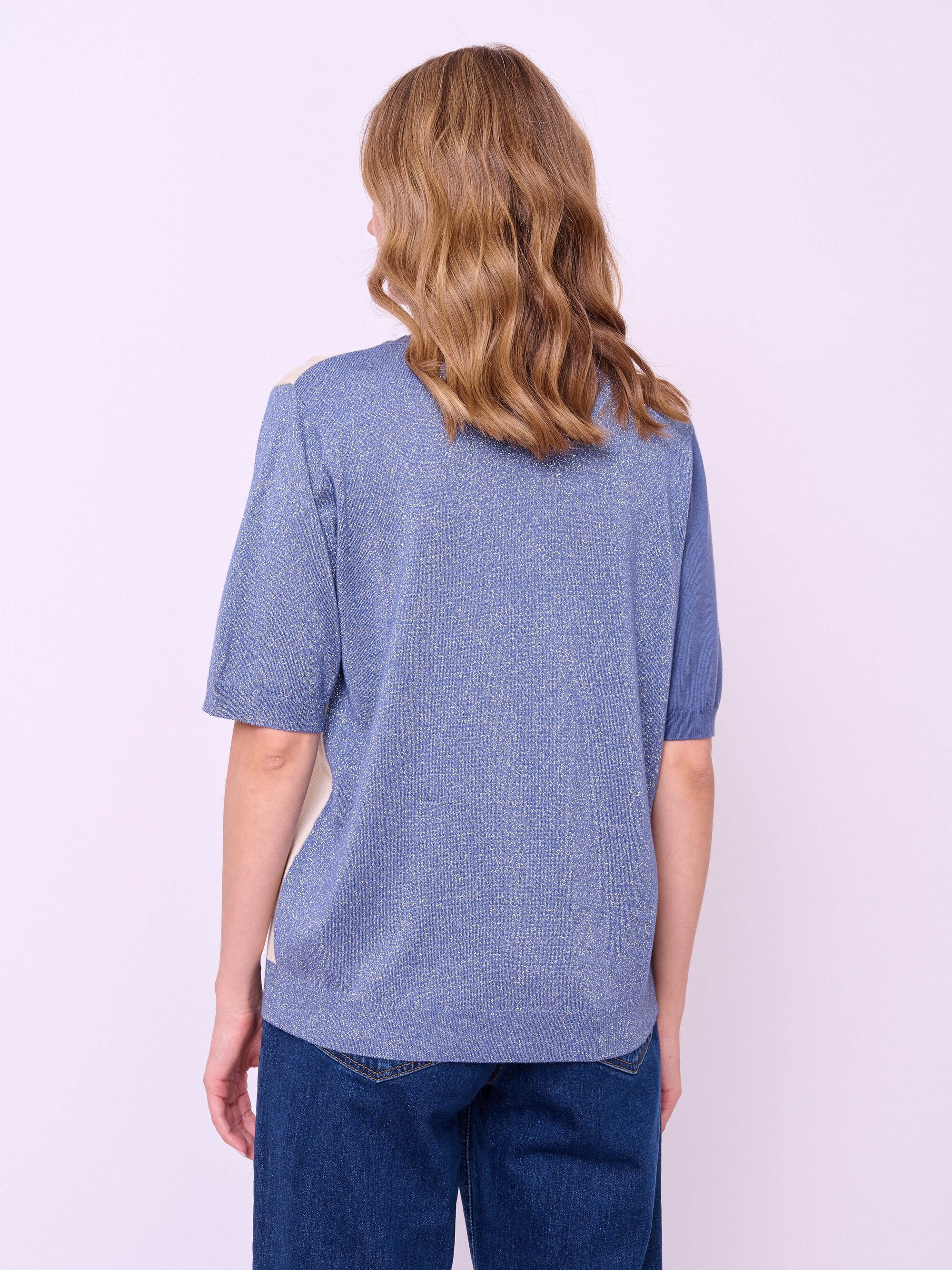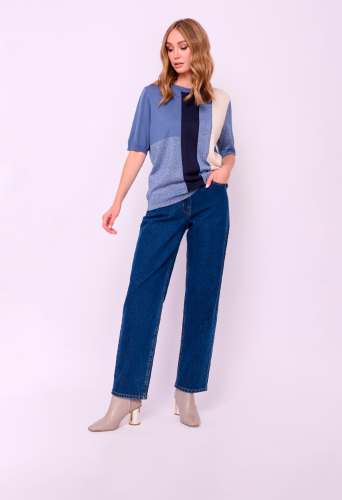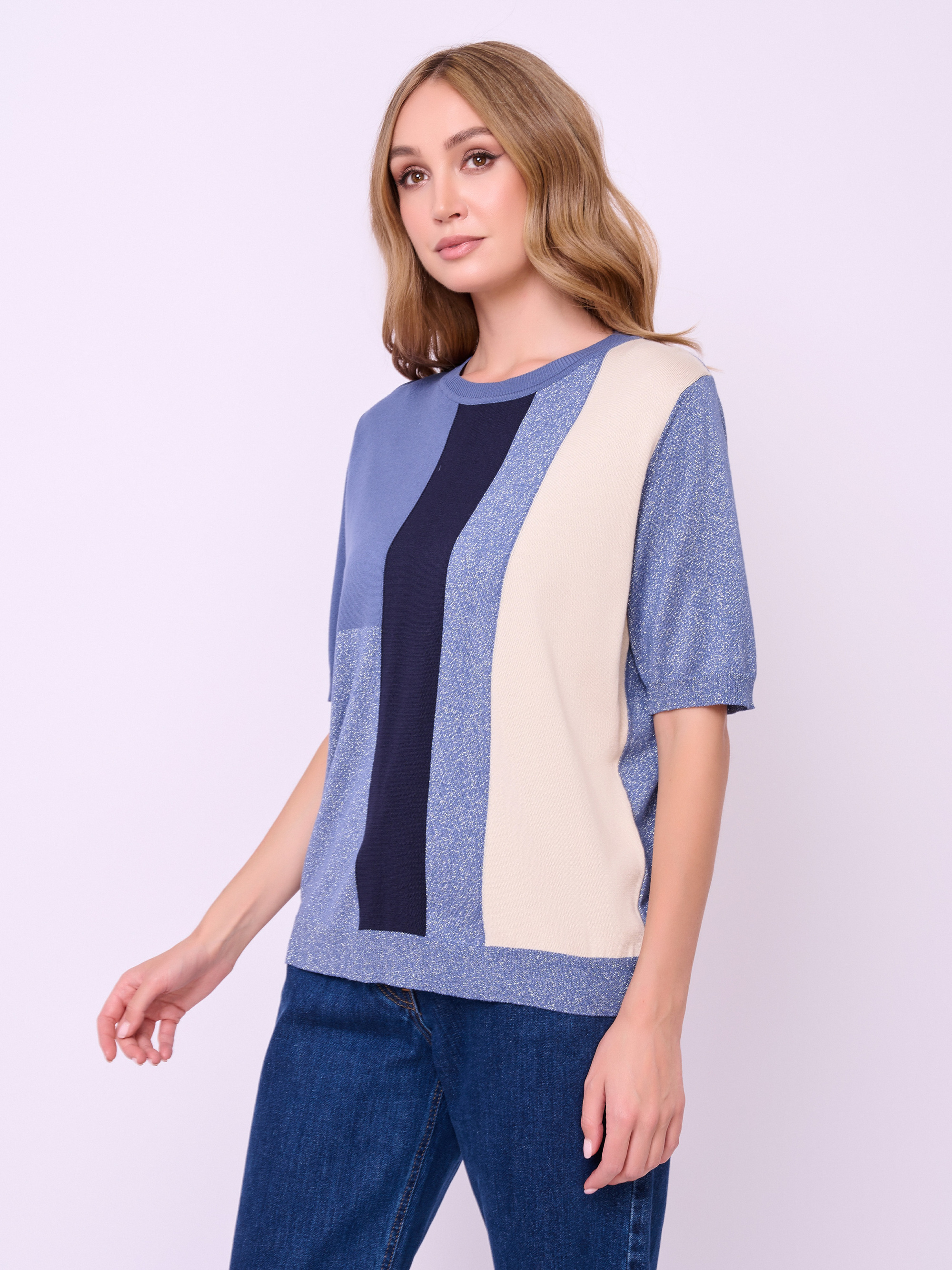 Трикотажный джемпер прямого покроя в стиле «колор блок» с округлой горловиной и короткими рукавами. Длина по спинке: 62 см