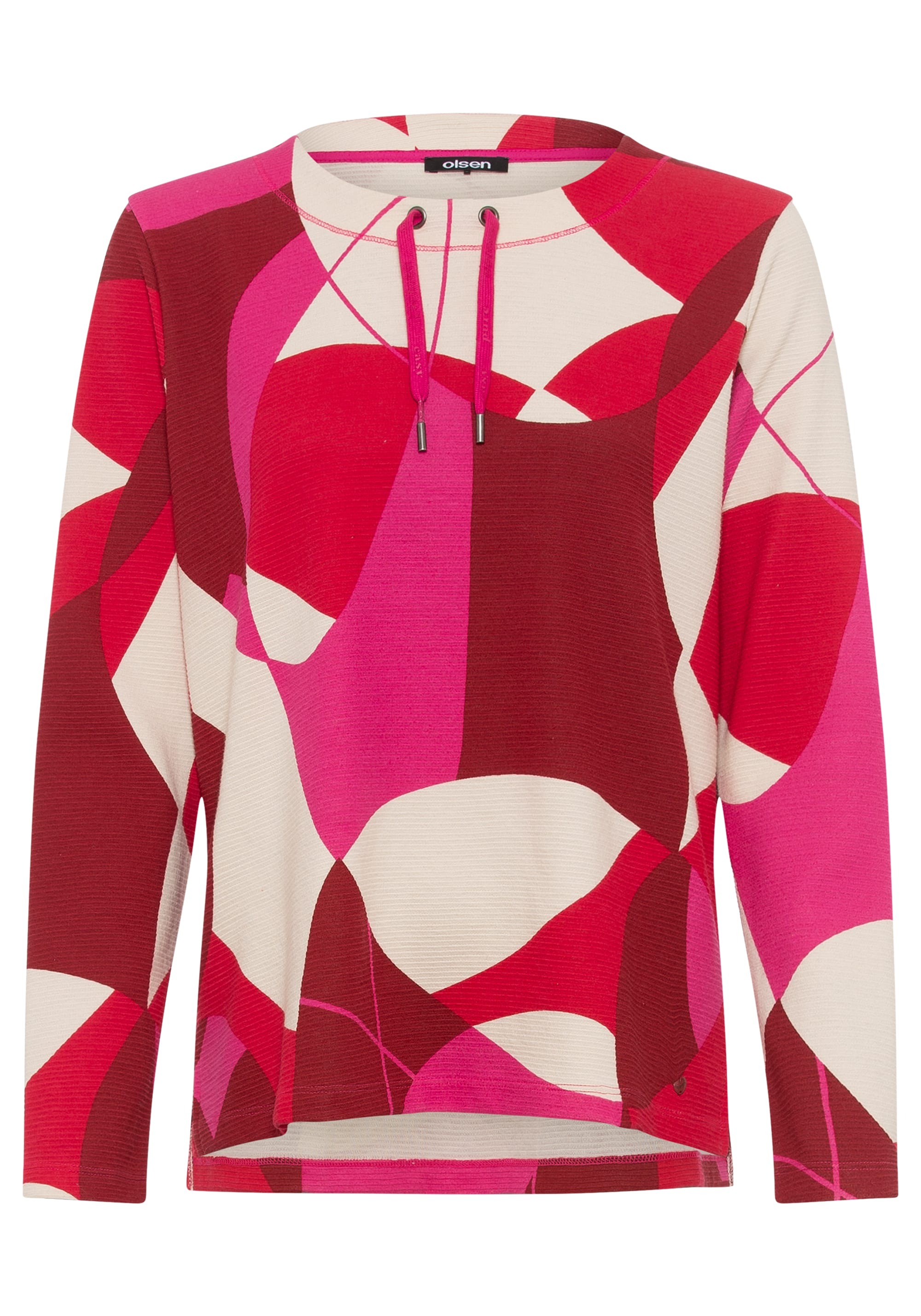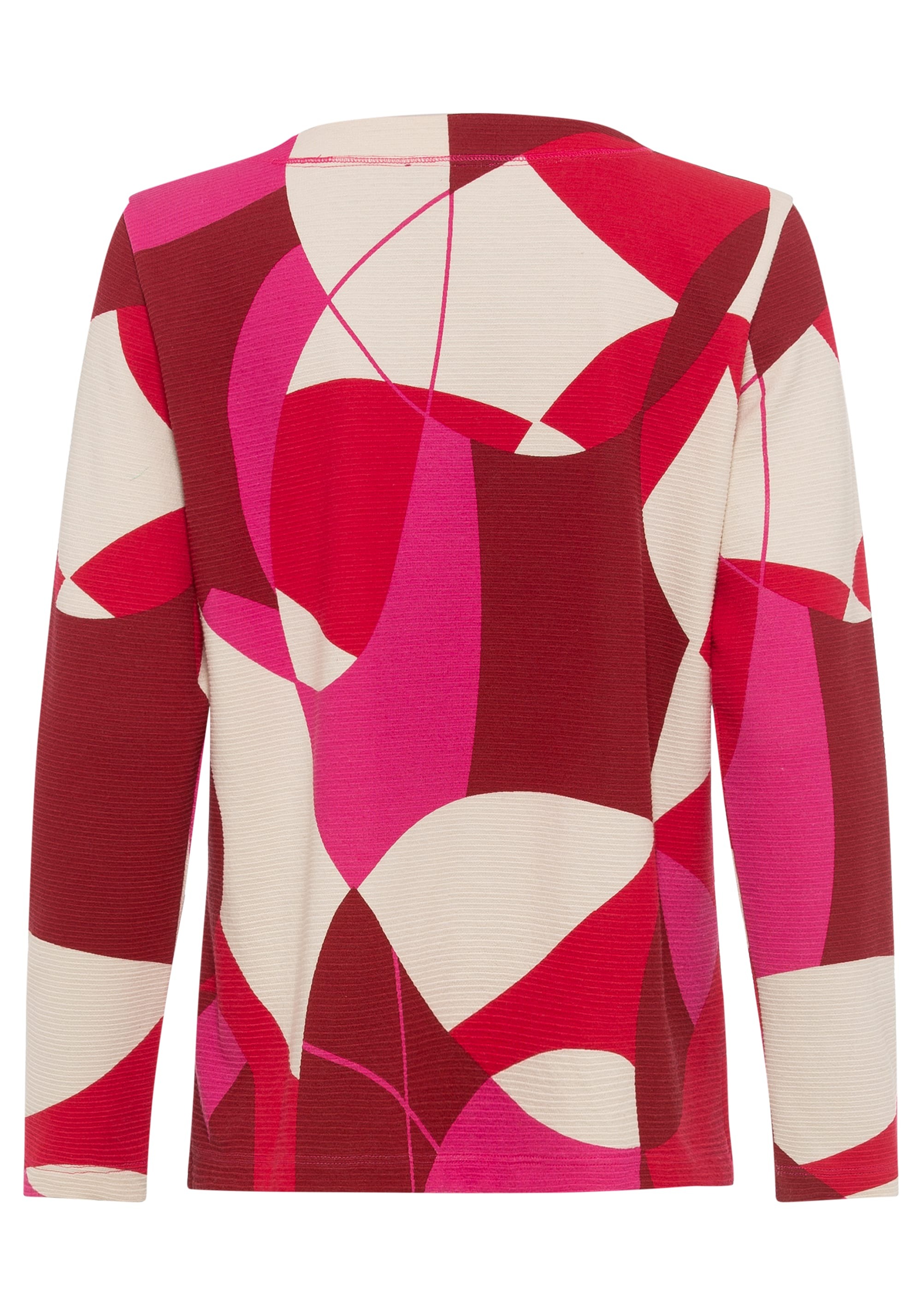 Трикотажный джемпер из джерси в рубчик украшен геометрическим узором по всей поверхности, напоминающим 70-е годы в ярких тонах. Детали включают небольшие боковые разрезы и завязки на закругленном вырезе. Модель Henny имеет прямой крой и слегка прилегает к телу.