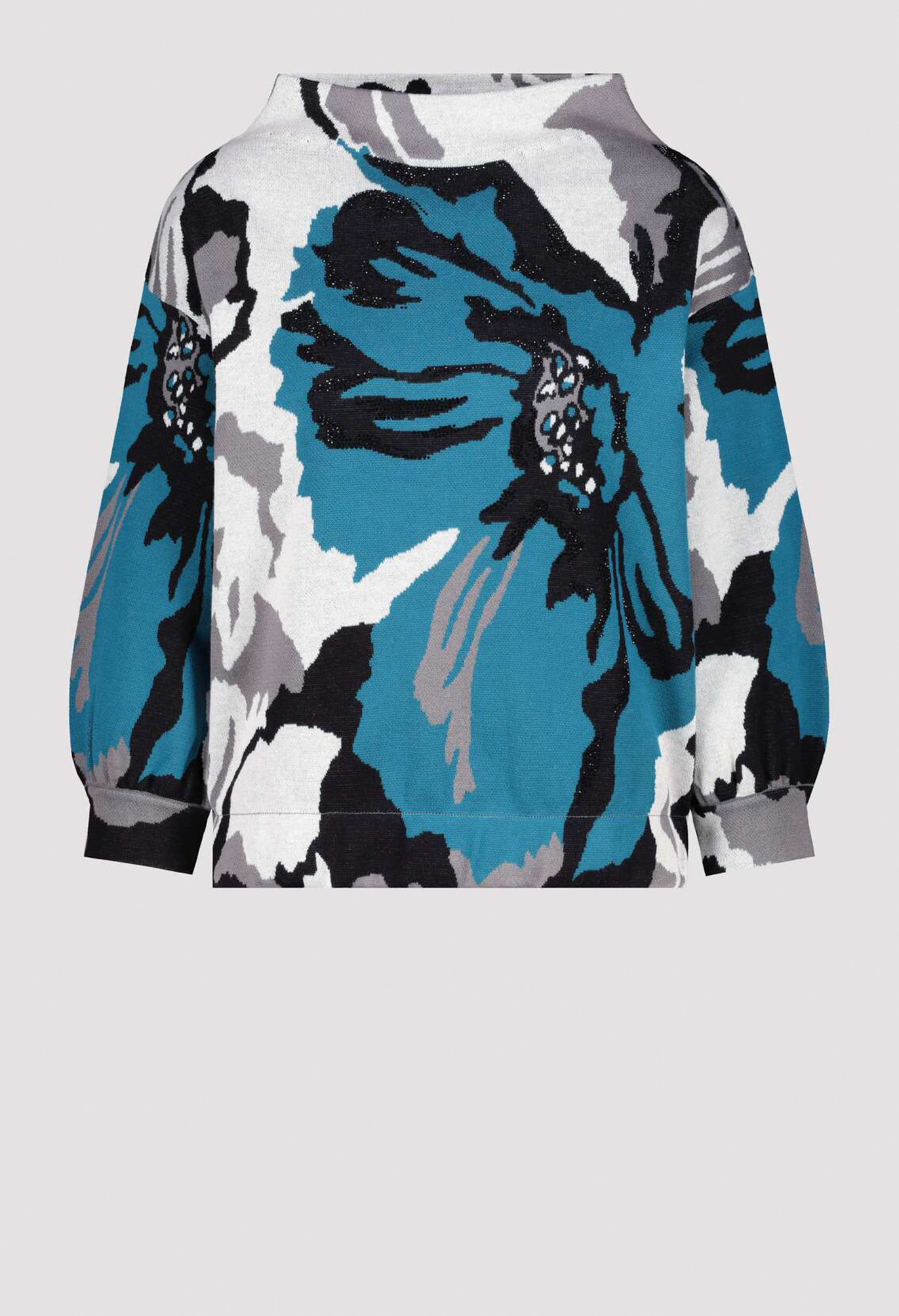 Удобный хлопковый свитер впечатляет красивой жаккардовой тканью с цветочным узором. Цветочный узор украшен сверкающими стразами. Регулярная посадка. Воротник-стойка, рукава 3/4, манжеты с рюшами.