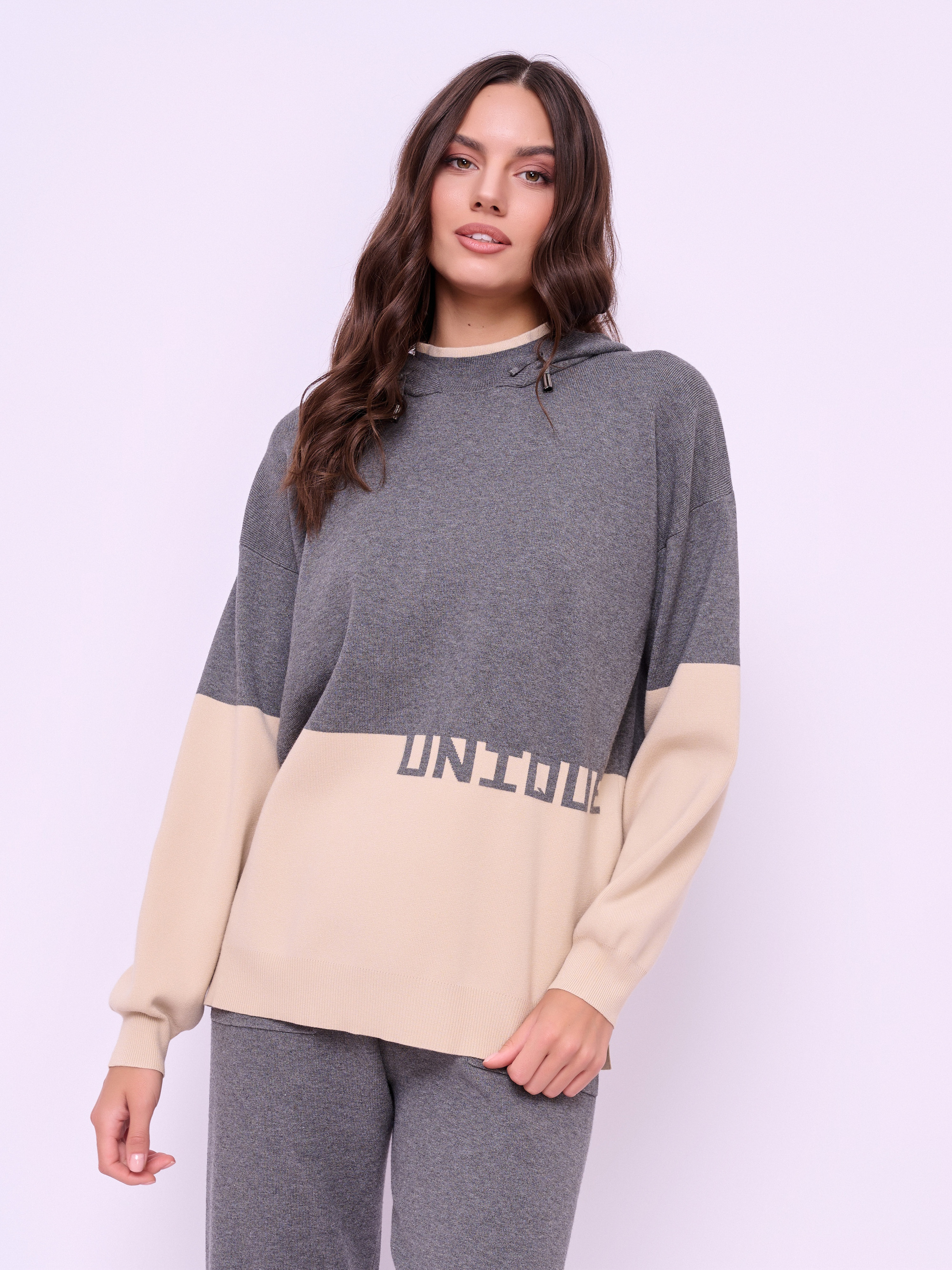 Детали: вырез горловины воротник-капюшон на кулиске, рукава длинные, покрой прямой, рисунок цветные блоки, с надписью, боковые разрезы. Длина по спинке: 66 см.