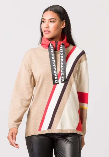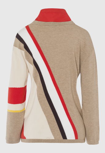 Вязаный женский свитер с вырезом в многослойном виде. Облегающий фигуру свитер из легкой, тонкой вязки с высоким содержанием вискозы. Сплошной узор в гармоничной цветовой гамме определенно заслуживает внимания. Воротник-стойка контрастного цвета с застежкой-молнией и атласными лентами с принтом создает эффектный многослойный образ. Вязаный свитер – это модно и необычно.