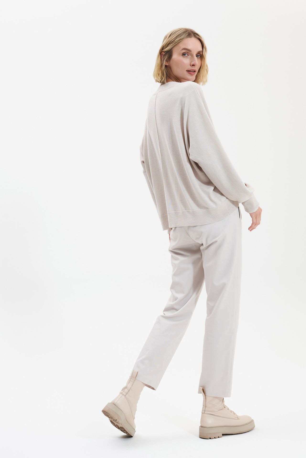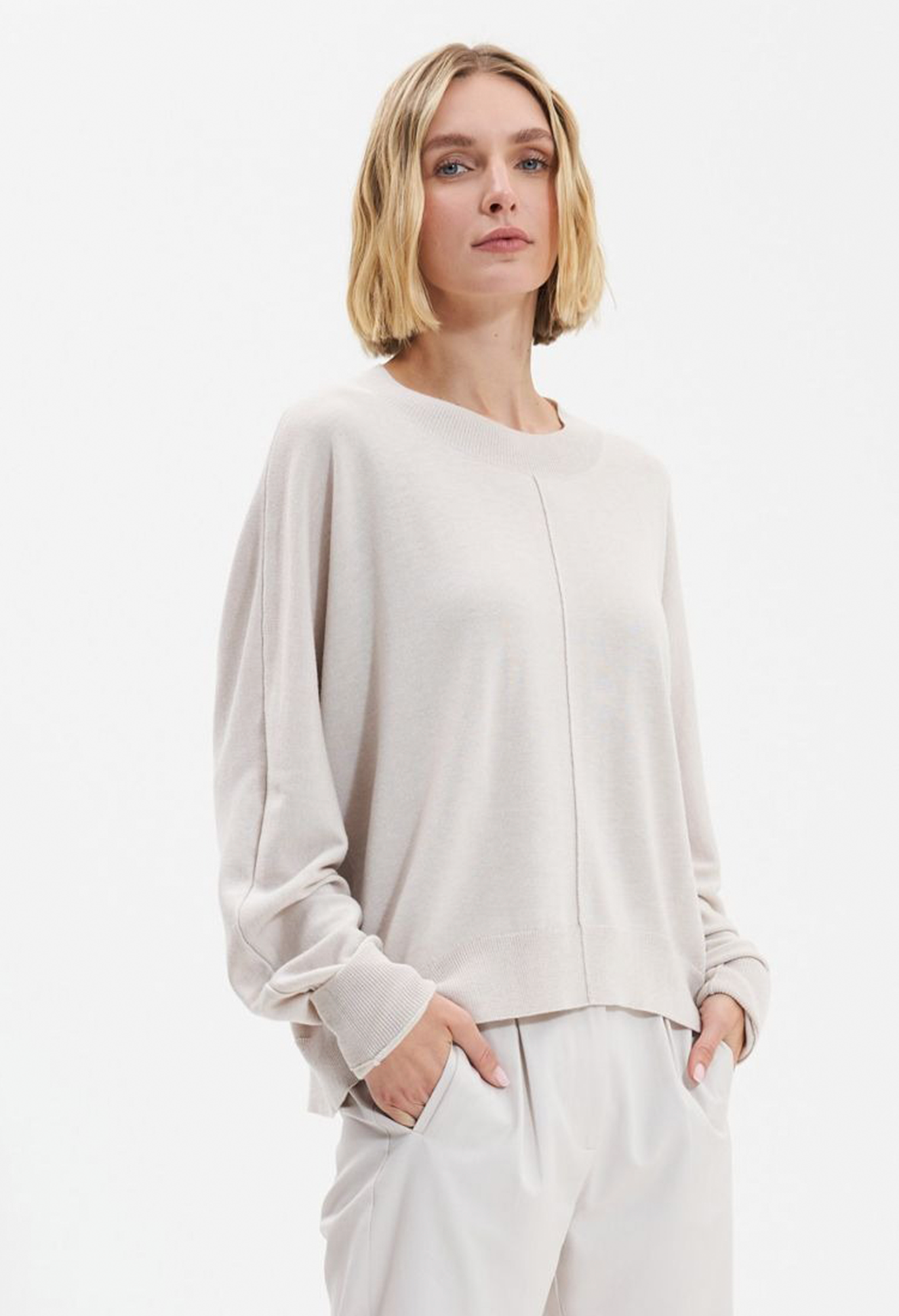 Трикотажный джемпер из смеси кашемира с круглым вырезом горловины. Передние и задние швы с припуском.