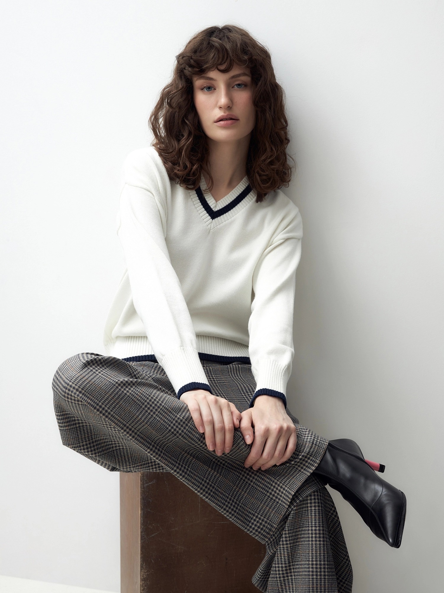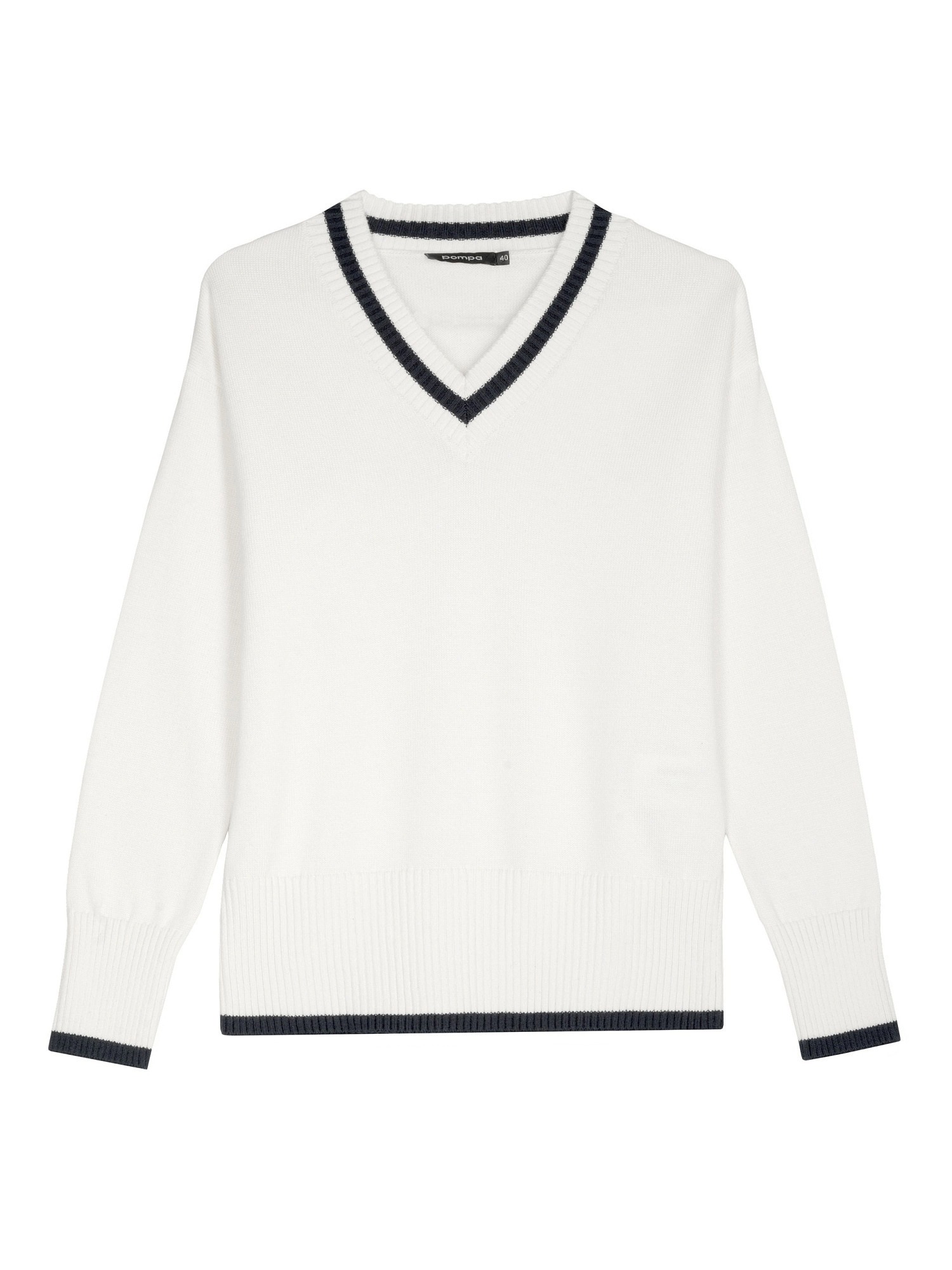 Джемпер с V-образной горловиной в нежно-белом оттенке из 100% хлопка, актуален в любое время года. Тонкая темно-синяя отделочная полоса придаст легкие морские нотки и будет выразительно смотреться с синими низами.