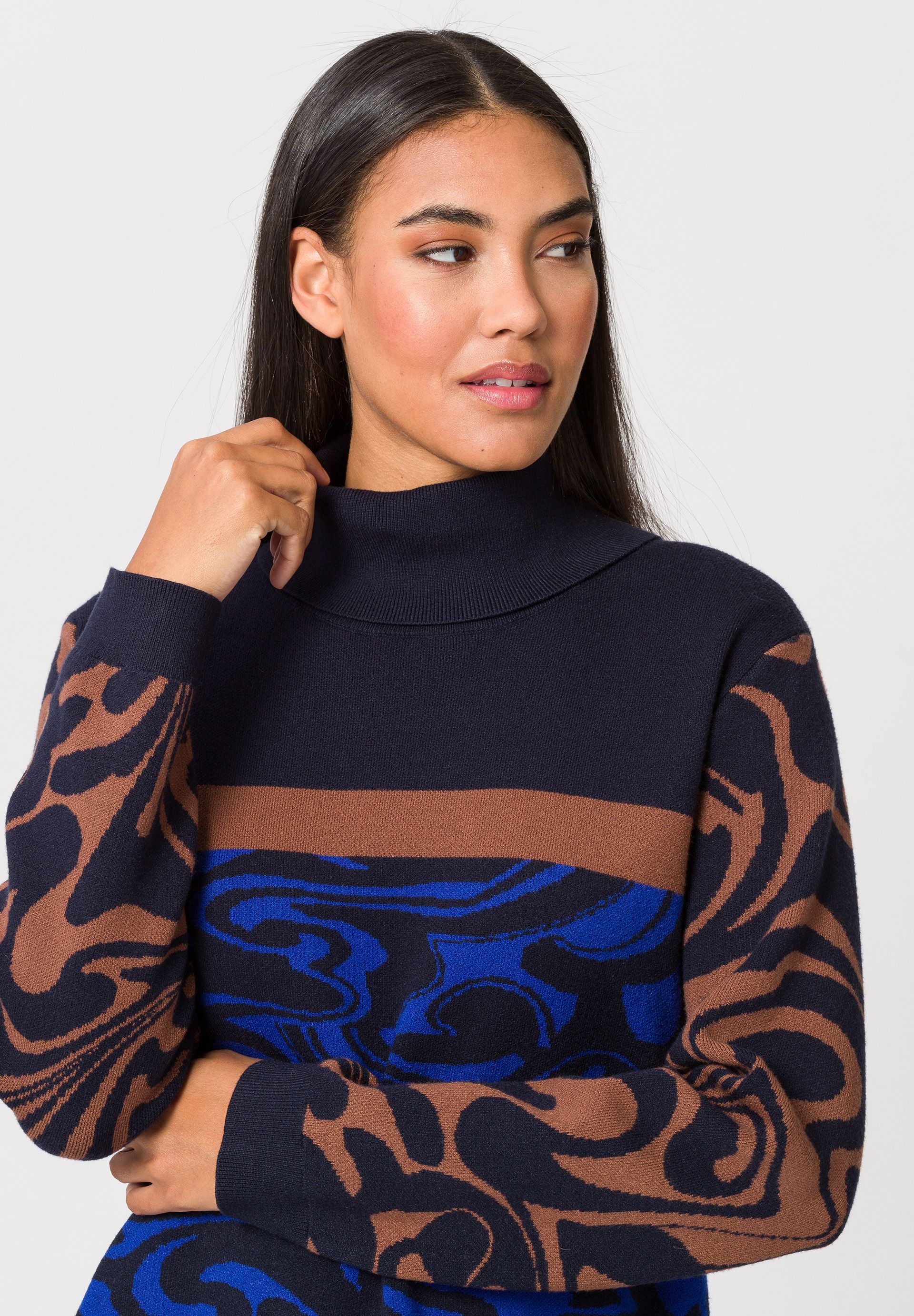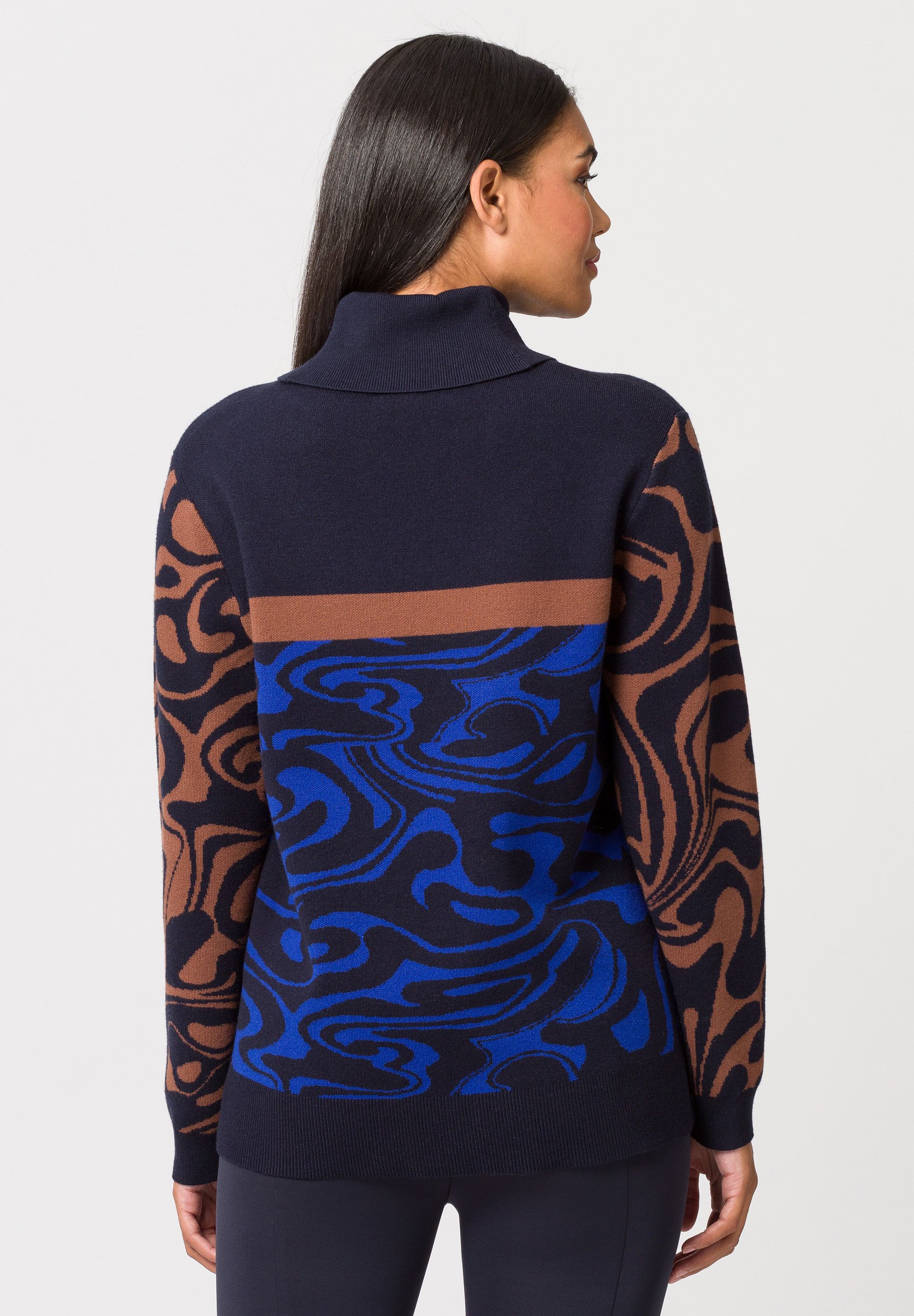 Вязаный свитер для женщин с чуть удлиненной спиной. Этот свитер тонкой вязки с высоким содержанием вискозы максимизирует повседневный эффект своего свободного кроя благодаря стильному узору по всей поверхности, слегка удлиненной спине и коротким разрезам по бокам.