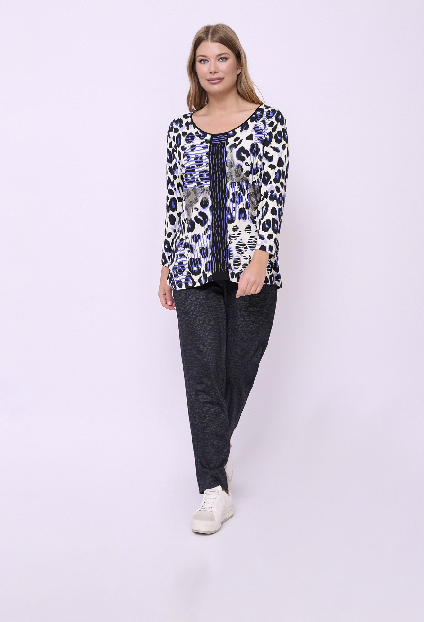 Джемпер трикотажный прямого покроя с глубоким округлым вырезом горловины, рукавами 7/8 и анималистическим рисунком. Длина по спинке: 64 см.