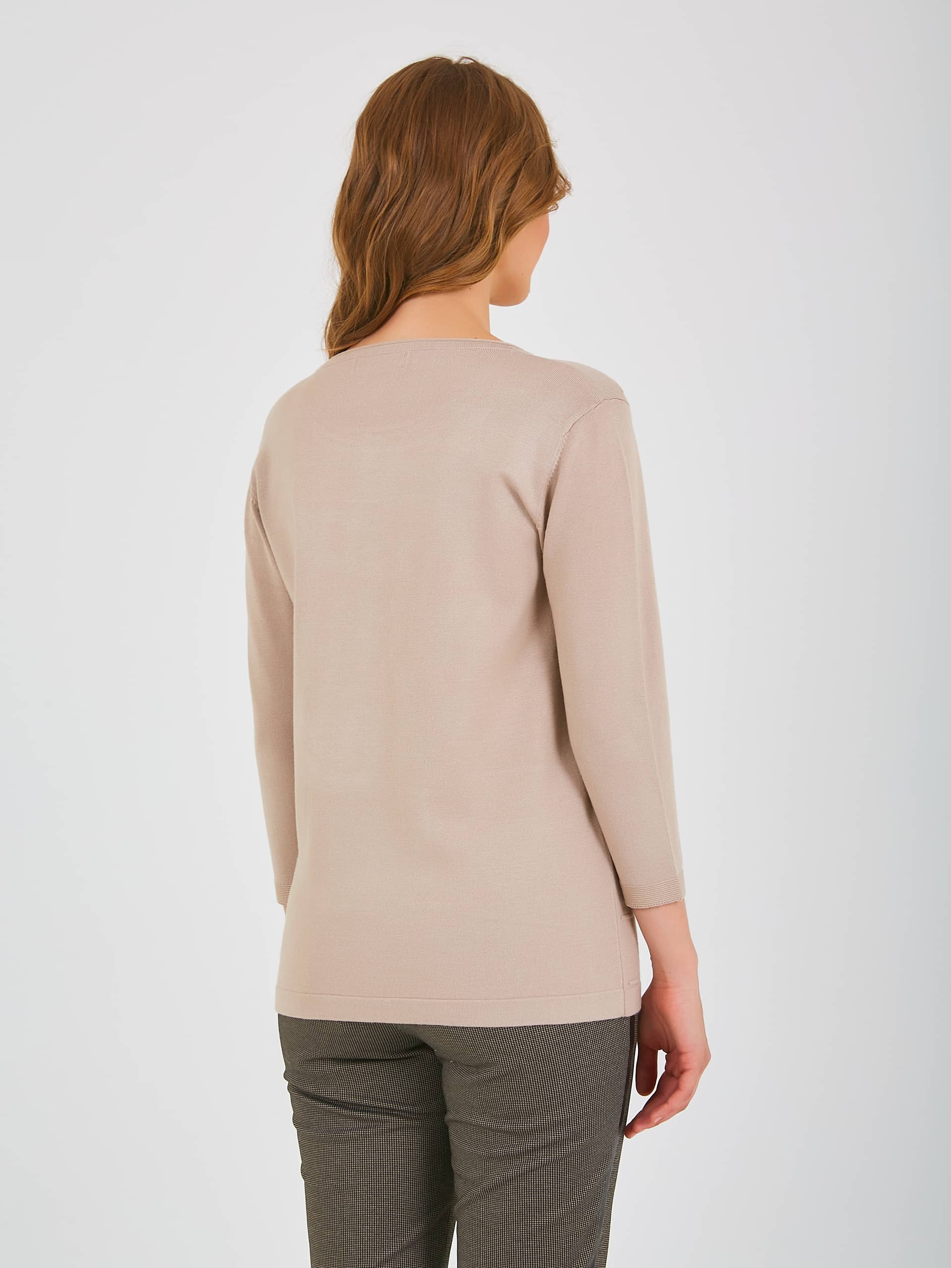 Cветло-бежевый джемпер c круглым вырезом. Поверхность изделия украшена небольшими горизонтальными полосками, которые подчеркнуты полосой из страз. Мягкий натуральный состав материала обеспечивает комфорт и тепло в прохладное время года.Осень-Зима'25/26. Капсула "Вино из одуванчиков"