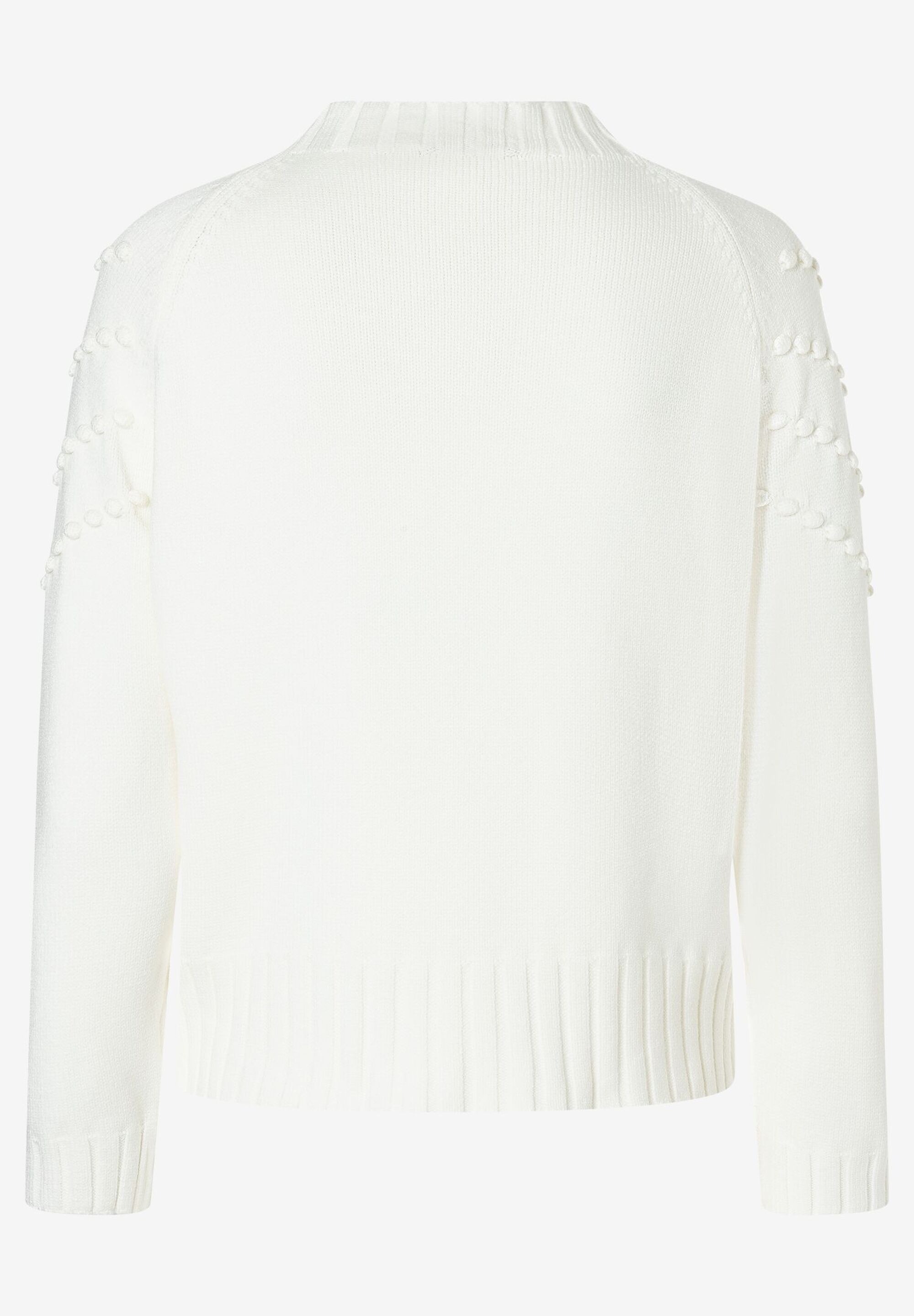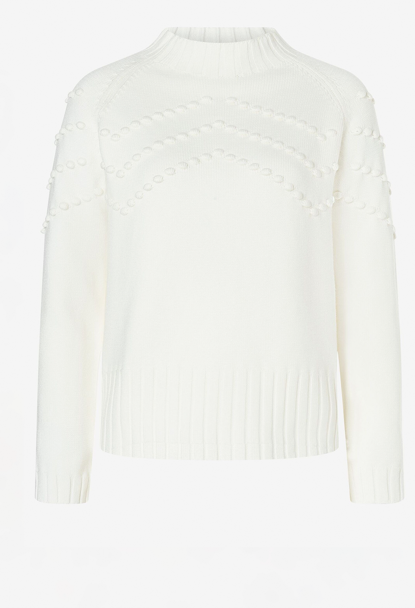 Короткий вязаный свитер с декоративными помпонами и высоким воротником в рубчик. Короткий, прямой формы, высокий воротник в рубчик. Рукава реглан. Встроенные помпоны спереди и на рукавах. Ребристые манжеты на подоле и манжетах.