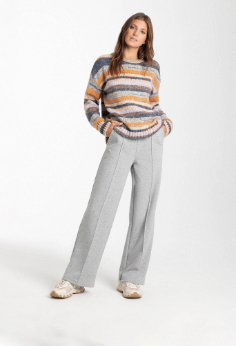 Пушистый, мягкий свитер с разноцветными полосками. Повседневный фасон со спущенными плечами, круглый вырез, длинный рукав. Ребристые манжеты на подоле и манжетах. Длина по размеру 42 - 58 см.