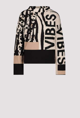 100% хлопок гарантирует высокое качество ношения. Свитер имеет интересный жаккардовый узор, напоминающий животное, с надписями и цветовыми блоками. Регулярная посадка, воротник-стойка. Длинные рукава с вырезом. Длина 44 размера 60 см.