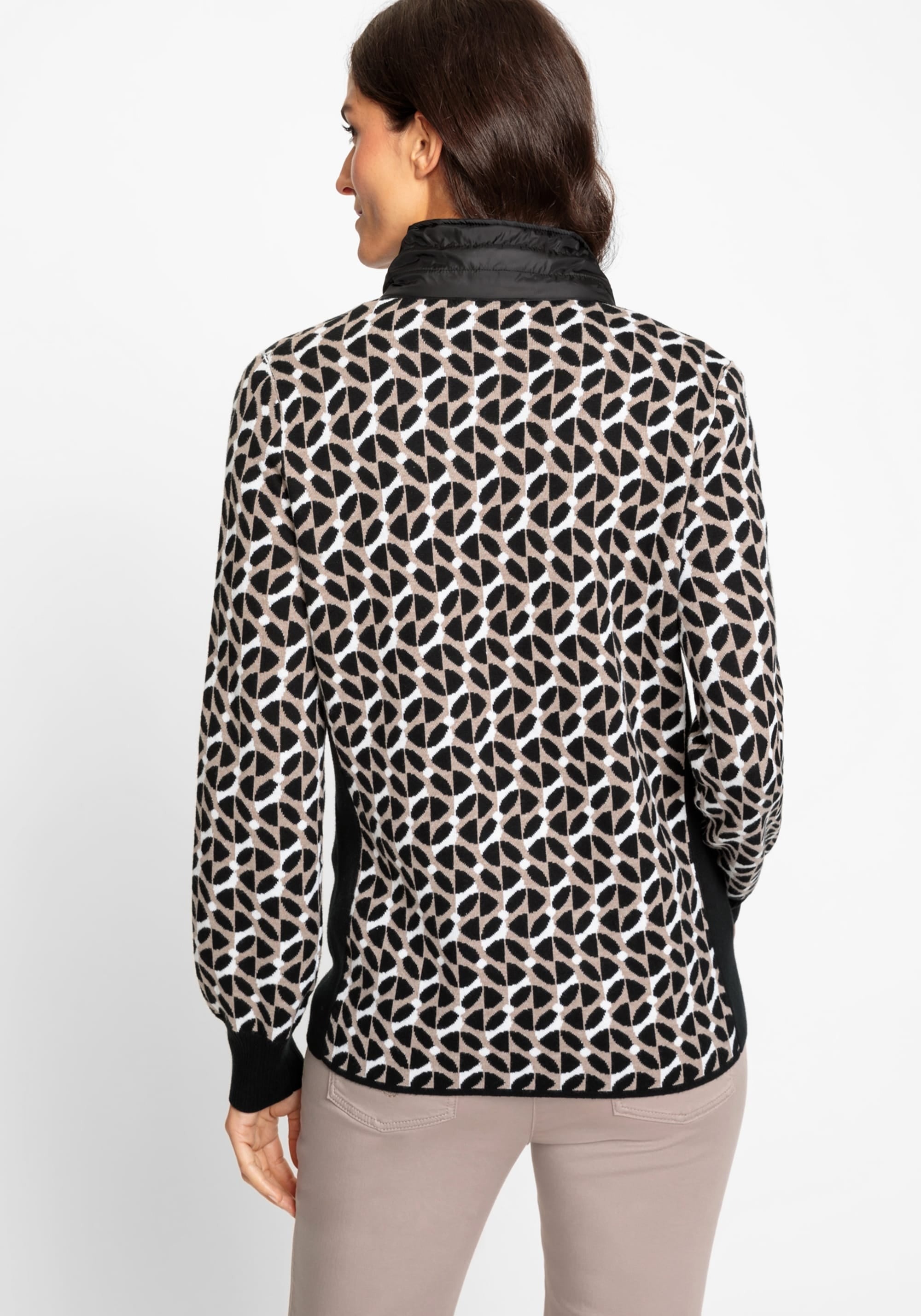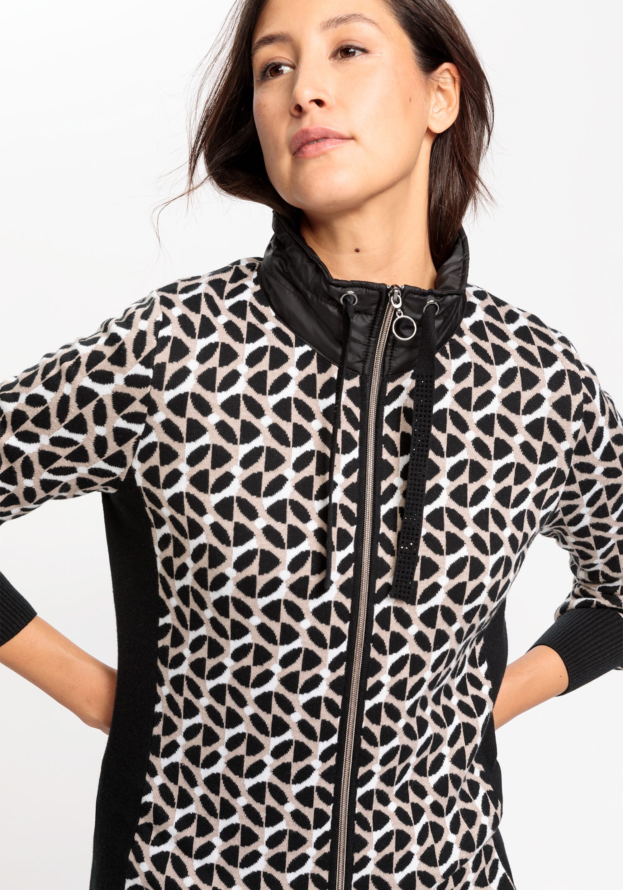 Трендовый геометрический узор по всей поверхности делает яркий акцент в этом спортивном стиле. Сочетание материалов: контрастный нейлоновый воротник в спортивном стиле дополнен стильной, но функциональной кулиской, украшенной стразами. Сплошные черные боковые панели создают иллюзию стройности фигуры. Высокое содержание хлопка для комфорта и воздухопроницаемости, двойная застежка-молния. Облегающий крой плотно прилегает к телу.