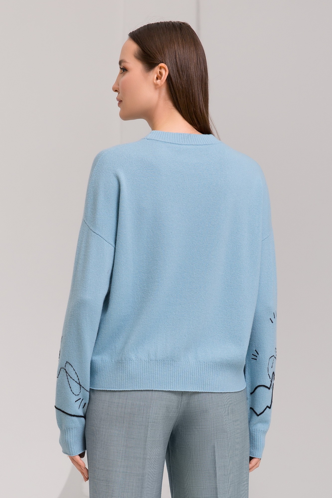 Шерстяной пуловер с изящной абстрактной вышивкой на рукавах.