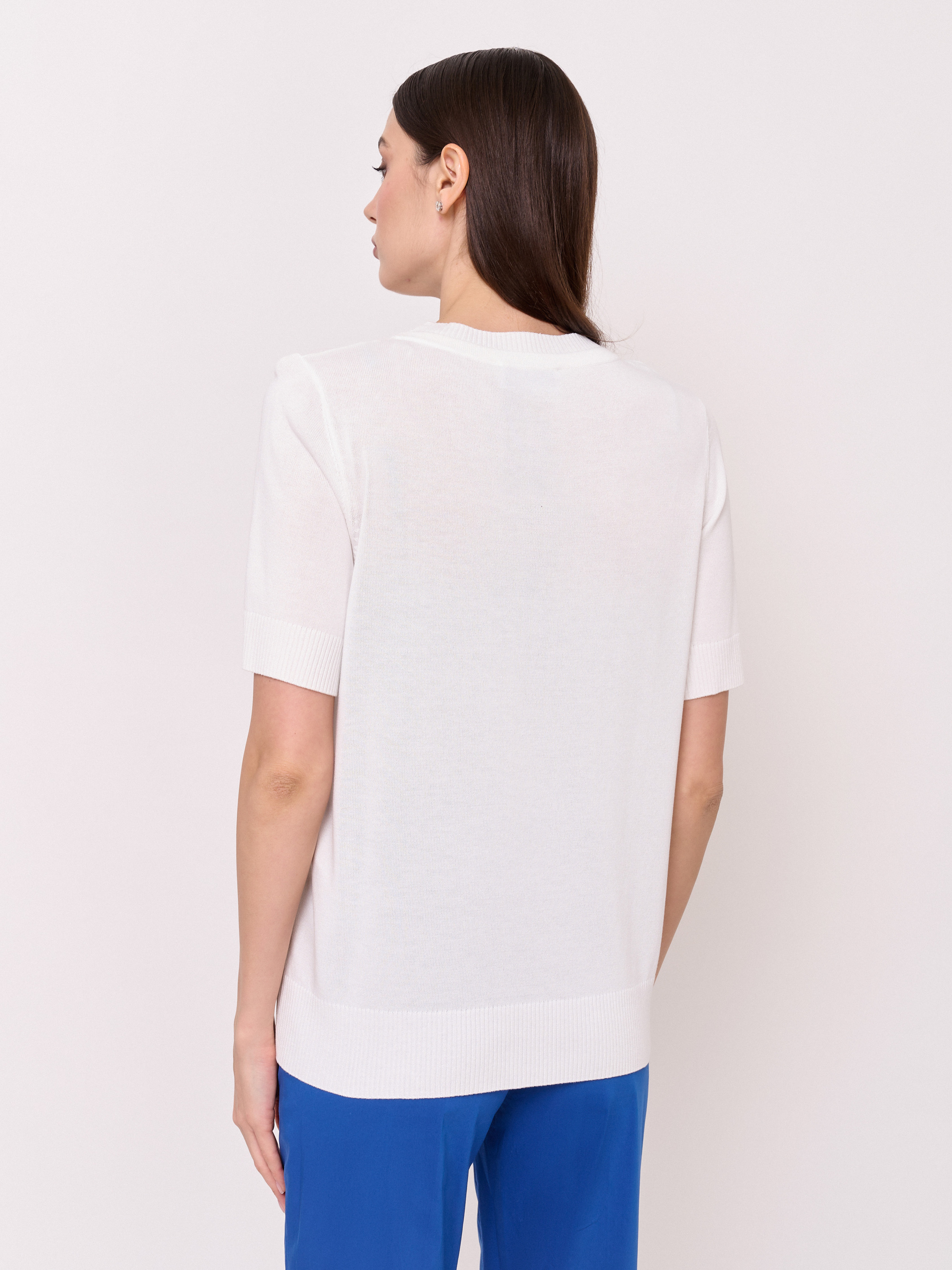 Детали: вырез горловины округлый, кулиска по линии горловины, рукава короткие, покрой прямой, рисунок полоски с люрексом. Длина по спинке: 61 см.