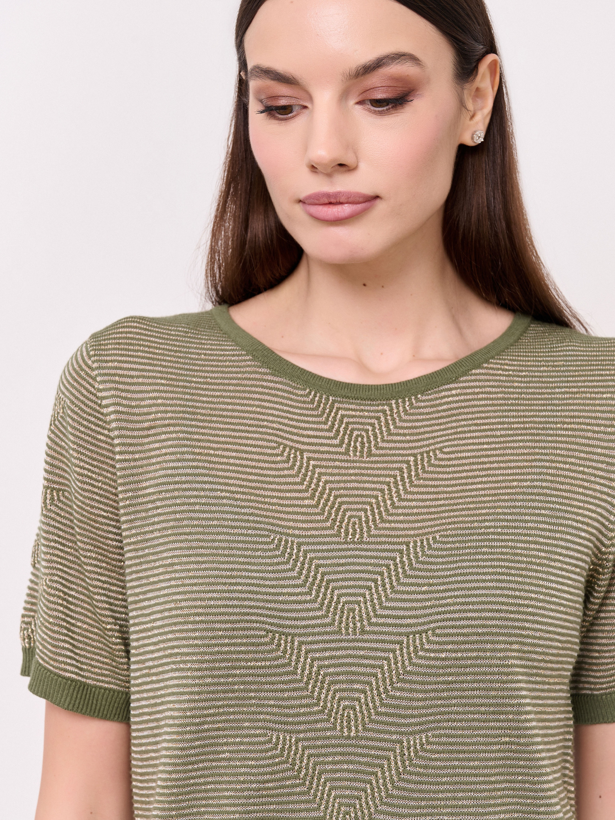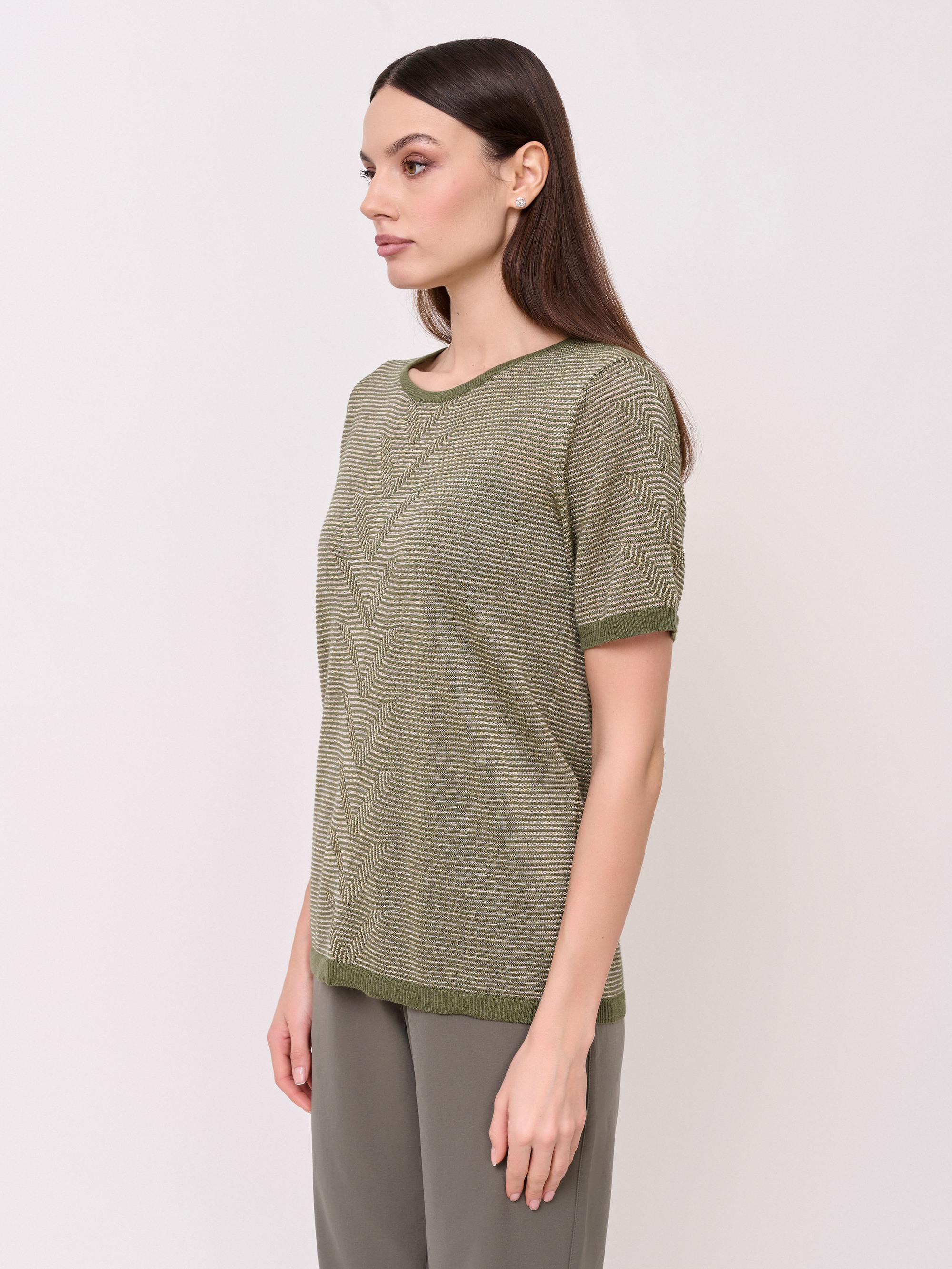 Детали: вырез горловины округлый, рукава короткие, покрой прямой, рисунок полоска, люрекс. Длина по спинке: 62 см.