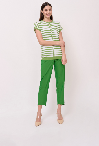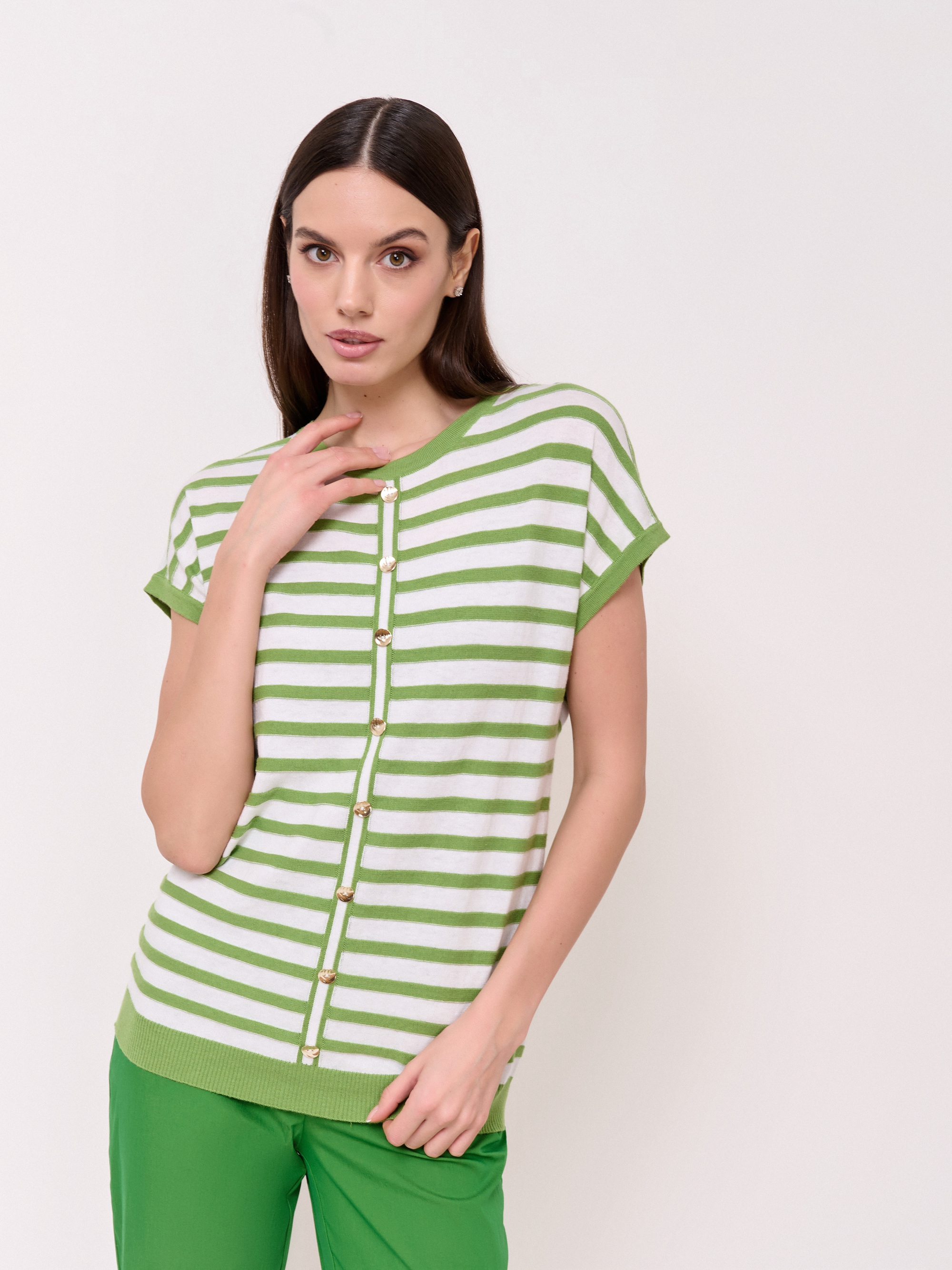 Детали: вырез горловины округлый, рукава короткие цельнокроеные, покрой прямой, рисунок полоска, декор в виде пуговиц по центру. Длина по спинке: 63 см.